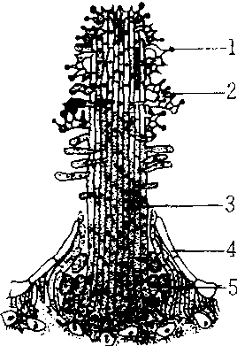 柱锈菌属 1.担孢子 2. 担子 3. 冬孢子 4. 寄主表皮细胞 5. 夏孢子 |