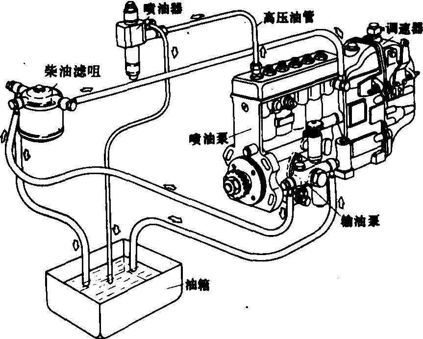 | 释义 | 柴油机供油系统fuel system for diesel engine按柴油机工作需要,将计量的柴油适时地以适当空间油束状态喷入燃烧室的装置。主要包括油箱、输油泵、柴油滤清器、喷油泵、调速器、高压油管和喷油器等(图1)。供油系统要保证形成良好的可燃混合气和燃烧的最有利条件,以满足柴油机在功率、扭矩、转速、油耗、排放、噪声、起动和使用寿命等方面的要求。供油系统中,影响柴油机性能的主要指标是喷油量、喷油正时、喷油速率、油束分布和喷雾状态。决定前三项的主要参数为喷油泵的凸轮速度、柱塞直径和出油阀特性参数、喷油器及供油系统中有害高压容积等。决定油束分布和喷雾状态的主要参数为供油系统压力波、喷油压力、针阀升程、喷孔数目、孔径和喷雾角度。合理地选择上述参数,使之最佳匹配,是提高柴油机性能的关键。