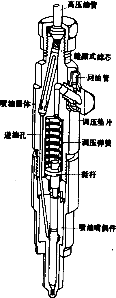 图1 柴油机供油系统 柴油滤清器 将混入柴油中各种有害杂质和水分排除,以减少供油系统中精密偶件的磨损,延长使用寿命。柴油滤清器排杂的方式有机械分离、重力分离和吸附三种。农用柴油滤清器以纸质滤芯为主,有卷筒式、旋装式等结构。 喷油泵总成 以给定的喷油压力和喷油速率,将计量柴油适时地输往喷油器的装置,包括喷油泵、调速器、输油泵和供油提前角调节器等部件。喷油泵可分直列式和分配式两类,前者用一副泵油元件供应一个气缸,后者用一副泵油元件供应各个气缸。 直列式喷油泵 即柱塞式喷油泵,由凸轮轴通过挺柱推动柱塞泵油,靠改变柱塞控制槽和柱塞套回油孔相对位置调节油量。结构有分体式和整体式。前者是装泵油元件的上体和装凸轮轴的下体分开,工艺较简单、装拆方便,但易漏油。后者分窗盖板式和全封闭式。窗盖板式泵体刚性较差,允许泵端压力为40~60兆帕,适用于非直喷式柴油机。全封闭式靠转动柱塞套调节油量,泵体刚性好,允许泵端压力高达70~100兆帕,漏油少,适用于直喷式柴油机,但工艺复杂,价格较贵。输油泵有活塞式、滑片式和膜片式等,一般装在喷油泵体上,由凸轮轴推动,以输送低压油通过滤清器到喷油泵。喷油泵上装有调速器,一般由飞锤、弹簧和杠杆等组成。飞锤离心力随转速变化,通过杠杆带动喷油泵调节齿杆而改变油量,从而自动调节功率和负荷间的平衡,以稳定和限制转速。农用柴油机以机械式调速器为主,按功能分全程式和两极式。全程式在全部转速范围内调节,适用于拖拉机。两极式在最高和最低转速时调节,中间转速由人工操纵,适用于汽车。供油提前角调节器能随转速变化调节供油角度,以补偿喷油始点随转速上升而迟后的缺点。 装在手扶拖拉机上的单缸喷油泵也属柱塞式。工作原理同直列式喷油泵,但凸轮轴和调速器均装在柴油机机体内,一般无输油泵和供油提前角调节器。 分配式喷油泵 有转子式和单柱塞式两种。转子式分配泵的分配转子带动柱塞和滚柱在内凸轮中旋转而泵油,并由转子出油孔依次将高压油输往各喷油器;单柱塞分配泵的平面凸轮旋转时推动柱塞泵油,同时又转动柱塞依次将高压油通过出油阀而输往各喷油器。两种分配泵的泵壳内均装有滑片式低压输油泵、机械式调速器和液压式供油提前角调节器,壳内充满循环的低压燃油作润滑和冷却用。分配泵结构紧凑,价格低,油泵转速可达2000~3000转/分,承受的泵端压力约45~65兆帕。适用于轮式拖拉机、汽车和中小型高速柴油机。 喷油器 将来自喷油泵的高压柴油适时地喷入燃烧室,使其雾化并与空气良好混合。喷油器包括喷油器体、调压弹簧和喷油嘴偶件(针阀和针阀体)等零件。喷油器体外径有25、21和17毫米三种。调压弹簧在喷油器体内通过挺杆压住喷油嘴针阀。低惯量喷油器(图2)能改善柴油机性能、降低排污。喷油嘴偶件分孔式和轴针式两种,分别用于直喷和非直喷式柴油机。农用中小功率柴油机的喷油嘴针阀直径为6、5和4(4.5)毫米。 喷油嘴偶件、喷油泵柱塞偶件和出油阀偶件都是柴油机供油系统中最精密零件。由于要保证高压工况的密封性能,配合面加工精度的要求特别严格。 高压油管 连接喷油泵和喷油器的管路。因承受高达40~100兆帕的柴油压力,必须采用冷拔无缝钢管。油管内径根据喷油量大小选用。油管长度应尽可能缩短,以减少有害容积。油管弯曲半径不应小于油管外径的6倍。为了保证各缸均匀性和喷油始点在规定值内,各缸油管长度应相等。