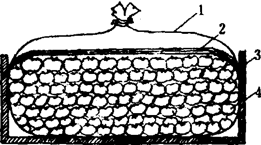图 1 柿果肉内的单宁细胞 脱涩方法 温水法 采收后, 将涩柿浸在温水中, 使柿果处于无氧呼吸的环境。9月中旬采的大磨盘柿, 绿色,涩味极强烈, 水温应在33~40℃之间。10月中旬至11月中旬采的大磨盘柿, 色正转黄, 涩味较轻, 水温15~25℃,经过16~18小时即可脱涩。温水脱涩的柿子,肉质仍脆, 但不耐藏, 商品价值低。 二氧化碳法 有: ❶自发定温法。把果实密闭在容器内, 使果实容积与剩余空间的比例为1:1.29, 容器内二氧化碳浓度增高到60%以上,氧气浓度降到1%以下, 在25℃下,3天可脱涩, 肉质鲜脆。 ❷恒温快速法。即在恒温条件下, 用高浓度二氧化碳进行短时间处理的脱涩法。二氧化碳脱涩过程分为脱涩诱导期和自动脱涩期两个阶段。首先在20℃下, 经18~24小时的预处理,然后用二氧化碳处理18~24小时(20℃),最后开封保温(20℃, 2~3天), 处理时用塑料薄膜帐把20~30箱果实罩封,充二氧化碳使其接近100%。在外界气温低时, 可用电热丝加温。此外, 需在帐内用小型扇风机, 使温度均匀。脱涩后不发黑不变软, 不发生二氧化碳生理障碍, 耐贮藏。 ❸干冰脱涩法。密封容器或用塑料袋加瓦楞纸箱在运送过程中进行。100升的容器充满二氧化碳需要200克干冰。用纸包二层,放在容器底部。上面铺上5厘米厚的棉花, 然后装上柿子。划着火柴检测, 确认二氧化碳已充满容器后, 密封好, 防止气体外泄。一般3~4天就能脱涩。 酒精法 用缸或箱子盛柿子, 以75%的酒精或白酒喷于果面上, 密封4~5天, 果实变为红色, 略带橙黄, 质软甘甜。改良酒精法是用15千克装的纸盒, 按纸盒大小用0.03毫米厚的聚乙烯做成薄膜袋, 将柿子装入袋中, 按每千克柿子加入4毫升酒精。为避免酒精直接接触果实可使用固态酒精, 把1~2块固态酒精(含40%)直接放入纸盒底部, 然后密封。亦可在果面铺一层比较厚的吸湿纸, 使酒精吸到吸湿纸上, 然后密封(图2)。此法称吸湿纸酒精蒸气脱涩法。用此法脱涩, 柿子软化现象减少。并可用在运输途中, 亦称运输脱涩。 混果法 将柿子与少量成熟的苹果、梨等混装于容器内密闭。利用成熟的果实所产生的乙烯, 促进柿子的无氧呼吸, 产生乙醛脱涩。在26℃下,3~7天即可脱涩。脱涩的柿子质地稍软, 味芳香。