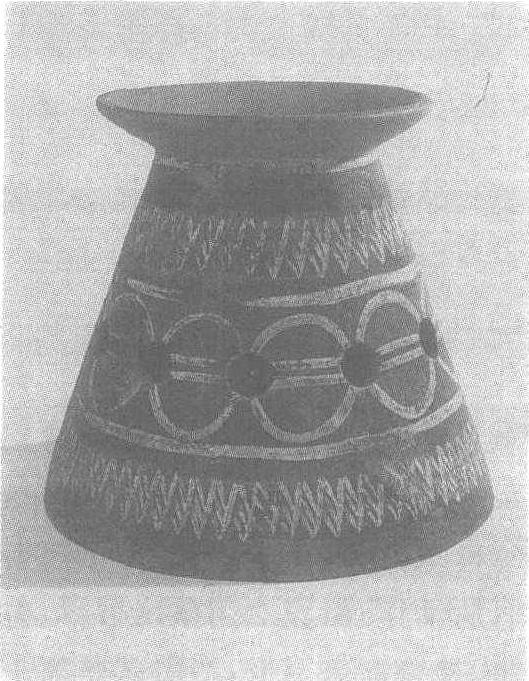 | 释义 | 栅栏半月纹镂孔彩陶器座新石器时代青莲岗文化。高24.1厘米,口径19厘米。1976年江苏省邳县大墩子遗址出土。江苏省南京博物院藏。此器上小下大,有一盘口,质地为泥质红陶,造型规整,器身以红、白两彩绘多层纹饰。上下两层栅栏纹夹以相对的两层半月纹,并有一圈镂空圆孔。此器纹饰繁复,色彩醒目浓重,具有典型的青莲岗文化艺术风格。青莲岗文化见“八角星纹彩陶盆”条目。