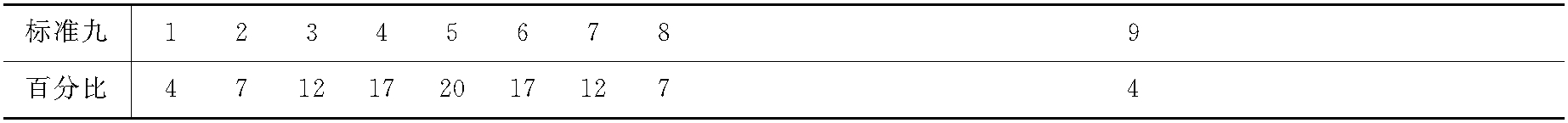| 释义 | 标准九stanine“标准化九级分制”的简称。正态标准分数的一种形式。是一个一位数字的分数系统,其均数为5,标准差为2,分数全距为1—9分。各标准九所对应的正态分布中的百分比如下表所示。该分数亦是一种正态化的标准分数,凡接近正态分布且可排列高低顺序的资料均可使用,按下表将得分最高的4%的受测者每人给9分,其次7%的受测者给8分,依此类推。 标准九所对应的百分比