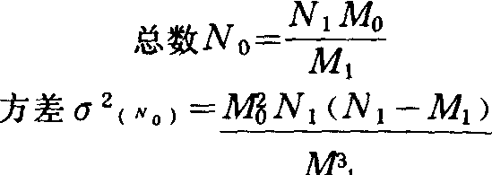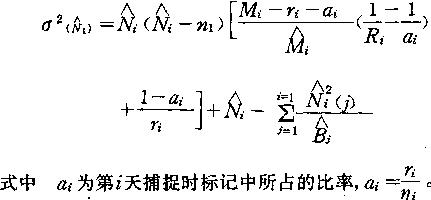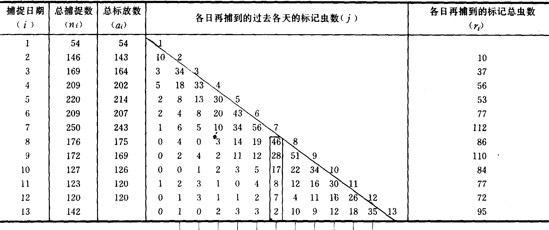 表2是由表1引出,表示在第i日捕到第j日(或j日以前)标记的再捕数(γ1),即表1中各行由左至右相加所得,如γ7=1+6+5+10+34+56=112,在表2中各列粗线上端的数即γi。在i日以后捕到的标记数(Z1),见表2中除第一数以外的各列累加数,如Z7=40+31+11+11+8 +9 =110 乔利法的种群总数估值公式为: