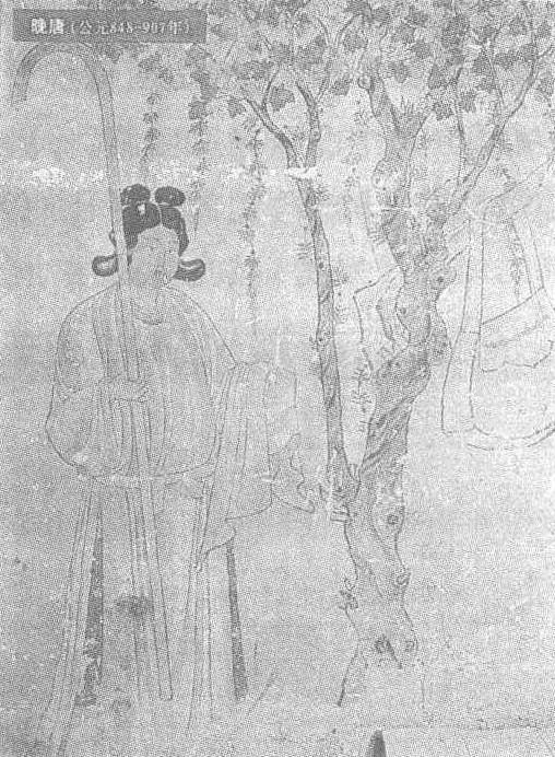 | 释义 | 树下侍女图壁画晚唐。纵182厘米,横89厘米。甘肃省敦煌县莫高窟第17窟北壁西侧壁画。此窟为晚唐时期河西都僧统摄沙洲僧政法律三学教主洪䛒的“影窟”。这幅侍女像位于洪䛒塑像的左侧,侍女梳双髻,身着圆领缺胯长袍,是晚唐女子的流行装束。左手托长巾,右手持杖,立于一树旁。树杈上挎一包,侍女眉微蹙,目光前视,饱含深切怀念之意。人物线条流畅,内心情感表达准确,其身旁之树,枝叶繁茂,枝叶的绘画尤为出色,树叶的正背面以不同颜色表现。笔触的轻重缓急,墨色的浓淡均显示出作者写实技巧的高超,整体效果突出。此图是晚唐壁画中的一幅优秀之作。