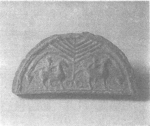 战国。高7.6厘米,径15厘米。1958年山东省临淄出土。北京中国历史博物馆藏。战国七雄之一的齐国都城建筑遗物。瓦当即筒瓦的头部。上面多有文字和纹饰,战国时流行半圆形瓦当,也称半瓦当,秦汉以后流行圆瓦当。此半瓦当正中饰一棵树,伞似地撑开,树下立双兽。文饰简洁、图案化。