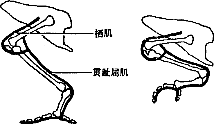 图224 鸟类栖止肌肉的模式图 栖肌ambiens某些具攀栖习性鸟类的耻骨肌。位于股部前内侧,呈长三角形,起于髂血前方的髂骨突起,以薄腱斜跨膝关节的前方,当鸟栖息于树上时,弯曲膝部,拉紧耻骨肌,肌腱以及趾浅屈肌,使脚趾同时机械地屈曲,攀住树枝,故名。 |