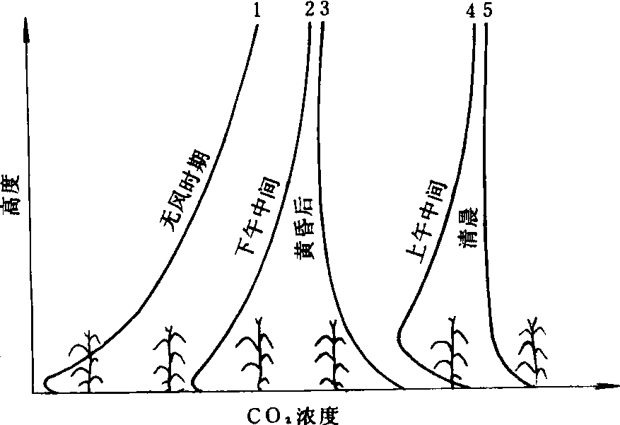 晴天旺盛生长的玉米地里空气中的CO2浓度的理想廓线 在晴朗静风的夜间,株间CO2往往可以高达400μl/L以上,但是在中午经常可以下降到250ppm以下,日较差可达150μl/L以上。晴朗静风的白天,生长繁茂的玉米冠层上CO2浓度常可降到100μl/L以上。在有风的日子,作物群体小时,只有20~60μl/L的日变化量。株间CO2日较差最大值,出现在作物叶子最密集的高度,一般在1/2株高到2/3株高处。在其它条件相同时,C4作物株间CO2日变化大于C3作物。在作物层以上的空气中,高差1米,CO2浓度只相差几个μl/L;在植株间,尤其在水平叶较多的群体内,往往可以有十几到几十μl/L的差值。夜间,株间CO2浓度垂直分布的型式与裸地相似,随着高度升高CO2浓度降低。在晴朗静风的夜间,植被内CO2浓度的梯度明显地大于有风的夜晚。白天,在直立叶量较多的群体(小麦、玉米等)内,上午CO2浓度最低值出现的高度随太阳高度增大而向群体下层移动,下午随太阳高度降低,CO2浓度最低值出现的高度又向群体上层移动。但在水平叶量较多的群体(菜豆)内,因为太阳辐射被水平叶减弱较多,下层叶片的光合作用始终不强。看不到CO2最低浓度层的移动。 增加大气中CO2浓度可提高作物产量和品质。北欧各国把增施CO2用于生产。CO2施肥的方法各不相同,在大田里土壤中施用大量有机肥,具有增施CO2的效果。在控制环境内,可以使用干冰,CO2发生剂(碳酸盐在有机酸中分解),高压CO2容器筒,在铁罐中燃烧丙烷、天然气体或煤油等方法增加CO2,但用干冰会使气温降低,燃烧的方法会产生有害气体。 |