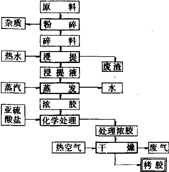 | 释义 | 栲胶生产工艺production technology oftannin extract用物理的(粉碎、浸提、浓缩等)和化学的(化学处理)方法,从富含单宁的植物原料中制取栲胶的全过程。其工艺流程如图1。