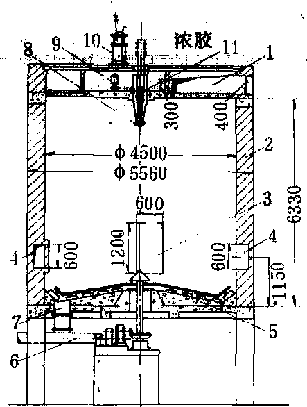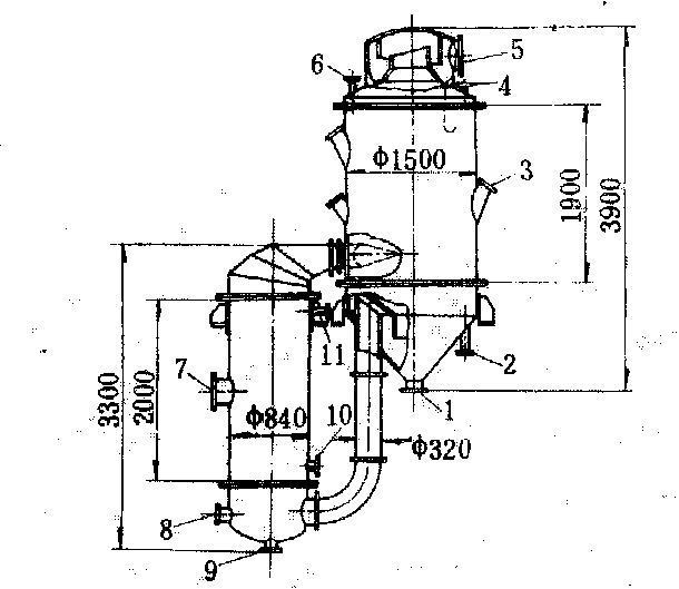 图2 6.5立万米加压浸提罐 蒸发设备有蒸发器、冷凝器和真空设备3部分。❶蒸发器:主要有外加热式(图3)、标准式、升膜式、降膜式和强制循环式等。几种蒸发器的传热系数和蒸发强度如表3。 ❷冷凝器:干式逆流高位冷凝器,使用广泛;浮头式列管冷凝器常与干式逆流高位冷凝器串联使用,可以充分利用热量。 ❸真空设备:往复式、水环式真空泵及水喷射泵使用较多;双级蒸汽喷射泵也被利用。 浓胶的处理 为了减少溶液中不溶物和沉淀物,浅化栲胶颜色,生产中常采用物理净化和亚硫酸盐处理方法。 物理净化方法 ❶过滤澄清:浸提液经过滤器、澄清槽,除去悬浮的颗粒原料和泥沙; ❷凝结剂澄清:如血蛋白用于栗木、栎木溶液的净化。