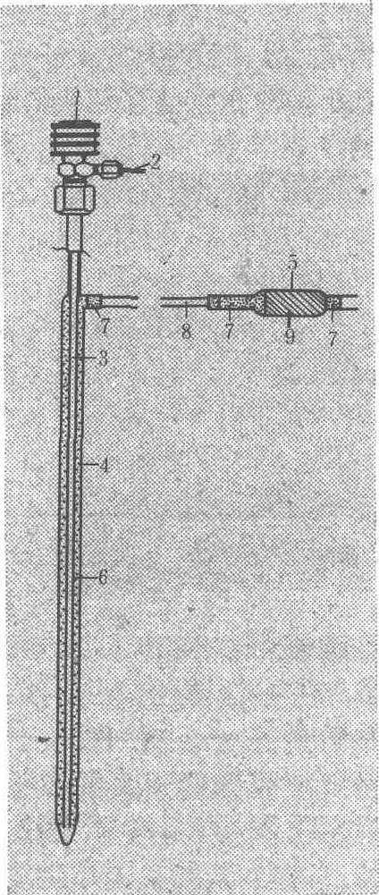 1.进样口;2.载气进口;3.分馏管内管;4.分馏管外管;5.收集管;6.硅烷化玻璃珠(1.5mm);7.硅烷化玻璃棉;8.无水硫酸钠;9.弗罗里硅土