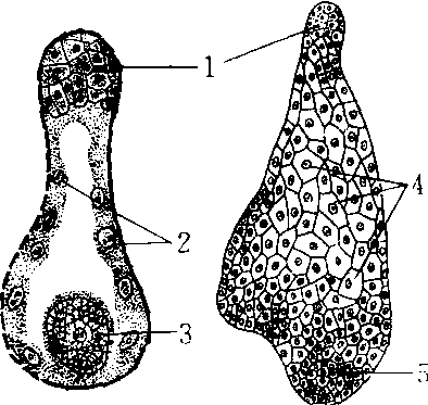 玉米的核型胚乳 1.反足细胞 2. 胚乳细胞核 3. 合子 4. 胚乳 5. 胚 |