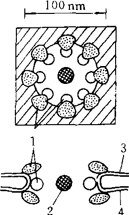 核孔 1. 核膜孔复合体颗粒 2. 中心颗粒 3. 核被膜的外膜 4. 核被膜的内膜 |