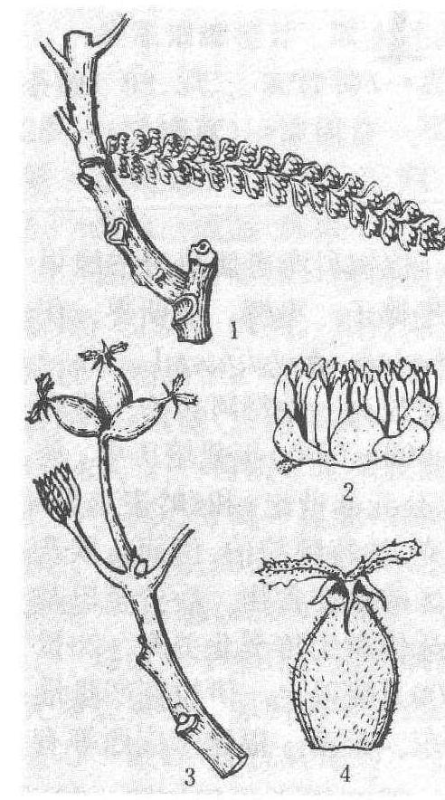 图 1 核桃的花 形态特征 树高可达30米。树冠大, 呈广卵形或圆头形。寿命长达数百年, 西藏加查县有近千年的核树皮灰白色,光滑, 老时变暗并形成浅至深纵裂。枝条粗壮,新梢棕绿色,具白色皮孔。混合芽呈球形, 营养芽为锥形或阔三角形, 雄花芽为侧生裸芽, 圆锥形呈鳞片状。叶为奇数羽状复叶,互生,长30~40厘米,小叶5~7片,总柄基部肥大有腺点, 脱落后叶痕呈三角形; 小叶长圆, 倒卵或广椭圆形, 具短柄, 先端微突尖, 基部为心形、圆形等, 表面绿色, 背面浅绿色, 脉腋有簇毛, 叶全缘或微显锯齿。雄花葇荑花序,长8~12厘米,花被6裂, 有雄蕊12~26枚,花丝极短,花药成熟时显黄色; 雌花序顶生或小花2~3簇生,子房外面密生细柔毛,柱头2裂呈羽状反卷(图1)。果实为坚果,圆形或椭圆形;外果皮肉质,表面光滑或具柔毛, 淡绿到深绿色, 有白色腺点; 内果皮骨质称为核壳, 表面有刻沟或浅坑; 种仁呈脑状(图2), 被有黄白色或淡褐色的种皮, 是主要可食部分。