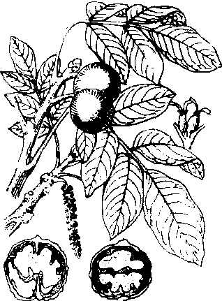 施肥 核桃施肥方法可参照上表。 采收及果实处理 核桃必须达到果实完全成熟才可采收。采收过早, 出仁率低, 含油量少; 播种则发芽率低, 且幼苗生长不良。完熟后采收比提前10天采收增产1成以上。完熟的特征是外果皮由青变黄, 一部分自然裂开。 核果采收后, 需经脱青皮、漂白等处理。脱青皮是将果实堆放于通风良好的阴凉场所并用湿草帘覆盖,以防温度过高和表土干燥,经3~5天后用木棒轻击,青皮即行脱落。脱青皮后的坚果应及时冲洗, 洗后还需进行漂白。漂白用漂白粉1千克, 加6~8千克温水溶化, 倒入60~80千克清水内制成漂白液, 将坚果倒入漂白液内,以木棒搅拌, 至表面变为黄白色时捞出,立即用清水反复冲洗, 以表面无白斑点为止, 漂白后的坚果可晒干。 病虫害防治 ❶核桃举肢蛾。又名核桃黑。为害果实。幼虫孵化前喷药; 捡拾早期落果深埋; 地冻前树盘覆土阻杀翌年出土幼虫。 ❷核桃瘤蛾。又称核桃毛虫。幼虫食害叶片, 严重时将树叶吃光。喷药杀幼虫, 树干束草诱杀下树老熟幼虫。 ❸草履介壳虫。以若虫吸食枝、芽汁液。树干周围培土挖沟, 阻杀早春出土上树若虫; 树干绑缚涂药塑料带粘杀若虫; 对上树若虫喷药。 ❹木橑尺蠖。幼虫食害叶片。幼虫期喷药; 人工捕杀或灯光诱杀成虫。 ❺核桃炭疽病。主要为害果实。喷杀菌剂。 ❻核桃黑斑病。为害枝梢、叶片及果实。发芽前喷石硫合剂; 发病前喷波尔多液或退菌特。 经济价值 核桃仁含脂肪63~75%以上, 蛋白质约15%, 碳水化合物约10%, 此外还含有磷、钙、镁、铬等矿质元素和几种维生素, 具有多种营养和医疗价值。核桃仁可直接食用,亦可加工制成罐头、蜜饯、琥珀核桃仁及糕点辅料。核桃仁用于烹调至少从元代便有记述, 明清宫廷膳食及现代食品都有不少以核桃仁为主、辅料的菜肴及点心, 群众用于副食的吃法更多。核桃可作核桃仁粥、阿胶核桃等具食疗药膳作用; 用于医疗有补气养血、润燥化痰、温肺润肠等功效。核桃仁油含亚油酸约73%, 能降低血浆胆固醇并使之变为胆汁排出体外。核桃仁对冠心病、支气管病有好的疗效。青皮汁液涂治顽癣颇有效。核桃木材纹理致密, 是制家具、工艺及枪托好材料。核桃壳可制活性炭, 是回收贵金属铬的最佳炭种。核桃青皮可作鞣质、染料。 核桃Juglansregia又称“胡桃”。双子叶植物,胡桃科。落叶高大乔木,树皮光滑,老树为银灰色。成熟的果实近于球形,为大型的坚果核果状(假核果),肉质的外果皮是由总苞和花被共同发育而成的,内果皮为坚硬的壳,有薄的也有厚的,表面有皱褶,可吃的部分为子叶(核桃仁),也有皱褶,营养极丰富,不仅含大量脂肪、蛋白质,还有多种维生素和钙、磷、铁、锌、锰等。果实可于10月开始采收,可生吃,也可榨油。著名的优良品种有薄壳的光皮绵核桃,纸皮核桃和用手压就破碎的露仁核桃等。核桃中所含脂肪的主要成分是亚油酸甘油脂,食后能减少肠道对胆固醇的吸收,是高血压、动脉硬化患者的理想滋补品。微量元素锌和锰是脑垂体的重要成分,常食有健脑益智作用。每日早晚各吃2个核桃仁,还可治神经衰弱。尤其是对患有头晕、失眠、健忘、腰膝酸软、全身无力等症状的老年人,确有滋补治疗作用。此外,核桃仁还有补气养血、温肺化痰、散肿消毒等功能。 核桃Persian walnutJuglans regia L,又称胡桃。胡桃科,核桃属。落叶乔木。2n=32。原产西亚。为重要坚果类果树。栽培历史悠久。主产国为美国、土耳其和中国。树高可达20 m。羽状复叶,小叶5~9枚。雄花成柔荑花序,长5~12 cm,雌花短,顶生成总状花序,有花1~4朵或更多。果实为核果,近球形,直径4~5 cm,外果皮肉质。核卵形或椭圆形,顶端尖,黄褐色,表面常皱脊,壳薄或稍厚。种仁被黄色或黄褐色,薄种皮,富含脂肪及蛋白质,味美。一般9~10月成熟。果实大小、形状,果壳厚薄及皱纹在品种间有很大差异。适生于干湿适中的山地肥沃土壤。种子繁殖;园艺栽培用嫁接,用实生核桃、核桃楸等作砧木。