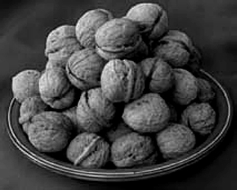 图 2 呈脑状的核桃仁 生长习性 核桃为深根性果树, 主根发达, 实生苗的幼根比幼茎生长快, 随着树龄增加, 树冠与根群不断扩展。核桃新梢的芽依着生位置有顶芽和腋芽之分。顶芽充实肥大,幼树期抽生发育枝,形成骨干枝构成树冠, 强枝除顶芽萌生新梢外,顶芽以下3~5个腋芽也能发生新梢,其中下部的腋芽多不萌发而成隐芽; 而弱枝仅顶芽能萌发, 故树冠内枝条稀疏。进入结果后, 顶芽多形成混合芽, 翌年抽枝而枝顶着生雌花成为结果枝, 由结果枝最上部的腋芽代替为顶芽, 称为假顶芽, 其他生长枝的顶芽为真顶芽。真顶芽形较尖而假顶芽较圆。真顶芽较假顶芽易于分化成混合芽。枝条生长角度大,大树枝条多呈水平, 一些水平枝先端的芽, 位于下方的较两侧或上方的芽壮实, 从而抽生下垂枝, 在间作农作物的核桃园内, 应定干高些并及时剪截下垂枝。隐芽寿命长, 对老树更新有利。 结果习性 雌花芽为混合芽, 着生于结果母枝顶端或稍下部位, 翌年春抽生结果枝结果, 每果枝着果1~3个或更多; 雄花芽为纯花芽, 着生于结果母枝顶芽以下数节, 亦有着生于结果枝下部的。核桃树同株异花,多数植株雌雄蕊异熟。风媒, 受精需多量花粉,一个健壮的雄花序可产生0.5克干花粉。核桃一些品种有孤雌生殖能力。开始结实年龄因类型和栽培条件而不同,新疆、陕西的早实类型播种后2~3年(个别当年)开花结实,晚实类型则需8~10年。核桃树喜光, 结果枝多在树冠外围, 结果枝可占新梢95%, 内膛结果枝不超过33%。核桃树顶芽性质及其比例、结果能力等与树体营养状况有关,营养缺乏时顶芽多抽生发育枝,即使开花, 也大量落花落果; 营养充足时顶芽以下第二、三芽也能形成混合芽, 坐果能力也强。 对环境条件的要求 核桃为阳性树种, 能稍耐侧方遮荫而不能忍受顶部遮荫, 耐荫程度中等。核桃也是喜温树种,其适宜生长温度是,年平均温度8~16℃,绝对最低温-2~-25℃, 无霜期150~240天,忍耐极限-30℃, 绝对最高气温35~38℃。夏季温度过高会引起果实或枝干日灼; 春季晚霜-2~-1℃花受冻,-4~-2℃新梢受冻。在华北冬寒春旱地区, 幼树易抽条。 核桃在平均年降水量400~1 200毫米的地区, 只要温度适当, 都能正常生长结果, 而以平均年降水量不超过1 000毫米,较为干燥的地区栽培为宜。核桃具有一定的抗旱能力, 但据有关资料, 开花后6周内如水分亏缺, 会使果实变小, 核仁不充实。秋季多雨常引起外果皮开裂, 种皮变黑, 核仁发霉。地下水位距地表2米以内的地方不宜种植核桃。 核桃对土壤有较强的适应能力,壤土、沙上以至石砾较多的土壤都有发育正常的大树。土壤pH值6.5~8.0范围都能生长结实,适宜范围为7.0~7.5之间。土层厚度需1米以上, 在土层深厚的黄土丘陵区, 即使肥力和降水条件较差,也能生长良好; 在土层浅、干旱缺水或过于潮湿、坚实及粘重土地, 植株生长不良甚至形成小老树。土壤盐渍度超过0.25%时,生长缓慢,结实少甚至不结实。氯化盐比硫酸盐类危害更大。 主要品种 中国的核桃分布范围较广, 且长期用实生繁殖, 变异甚多, 故有许多品种或品系。根据核的厚薄可分为4类: ❶露仁类。壳极薄, 壳面局部薄至形成小孔穴,露出种仁,故名露仁。坚果小或中大,出仁率极高, 一般在60%左右, 易取整仁,但保存不易。 ❷薄壳类。俗叫绵核桃。壳薄, 壳面无孔穴,不露仁,坚果大小各地不一,出仁率较高,一般为45~55%。内褶壁不发达,隔膜薄而软,能取整仁。 ❸半薄壳类。俗叫二性核桃。壳稍厚, 内褶壁发达, 较坚硬, 隔膜革质, 较薄, 取仁稍难, 但尚可取出整仁。出仁率一般在45%左右。 ❹厚壳类。俗叫夹核桃。壳最厚, 内褶壁发达, 隔膜骨质, 厚而坚硬, 取仁极困难, 破壳后亦不能取出整仁。出仁率低, 一般在40%以下。 主要品种、品系有: ❶户县露仁核桃。产陕西户县。坚果较大, 重约14克, 壳极薄, 壳面有孔穴, 仁饱满, 易取, 味甘而香。出仁率达53%, 仁含油率71.37%。5月上旬开花, 9月中旬成熟。 ❷光皮绵核桃。产山西汾阳。坚果大, 重约17~25克, 壳薄, 取仁容易。出仁率为58.19%,仁含油率为72.65%。9月中、下旬成熟。 ❸穗状绵核桃。产山西灵邱。坚果较小, 重约6克,每穗着果10~15个, 最多达30个以上,成串而生, 故又名串子核桃。 ❹隔年核桃。产陕西扶风。播种后2~3年即能开花结果,故又名当年核桃。坚果大小不匀, 重约10~12克, 壳薄, 易取仁。出仁率57.7%,仁含油率56.6~65.4%。9月中旬成熟。 ❺薄皮绵核桃。产新疆库车,当地称纸皮核桃。坚果中大,壳极薄,取仁容易,出仁率36.38%,仁含油率74.79%。2~3年生幼树即可结果, 每年开花3次, 第一、二次果可以成熟。陕西也有一年结两次果的核桃。 ❻元丰核桃。山东省果树研究所从新疆早实核桃实生树中选出, 1979年命名。坚果卵圆形, 壳厚1.3毫米,出仁率46.25%。10~12年生株产约12千克。 ❼辽宁核桃1号。辽宁省经济林研究所由河北薄皮核桃与新疆丰产纸皮核桃(拟)杂交育成。坚果圆形或长圆形, 重约9.1克,壳厚0.45毫米, 可取整仁。出仁率约73.5%。 ❽薄壳香核桃。北京市林业果树研究所从新疆核桃实生树中选出。坚果圆形, 壳厚1.04毫米, 可取整仁。出仁率约60%。9年生平均株产10千克。 此外, 各地选出的优良品种和品系有辽宁省的新纸皮、辽宁核桃2号, 山东省的上宋6号、东王1号,北京市的秦城35号、西寺峪1号、石门1号等, 还有稀少的红瓤核桃, 种仁红色。 栽培