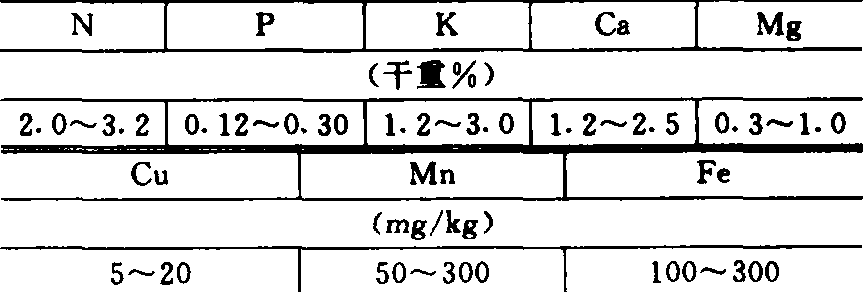 核桃树耐旱不耐涝,但在过于干燥和瘠薄的沙土或山地上,生长逐年衰弱,易长成“小老树”。在粘重板结的土壤中,容易发生先端枯死。核桃组织内含氮(N)、钾(K)、钙(Ca)较多。每收获50千克核桃要从土壤中摄取1.4千克氮。氮素不足枝短而细,叶片黄绿,早脱落,花量少,落果多,大小年严重;而氮肥充足,对树体生长和产量均有明显影响。核桃叶片中营养元素的含量范围见表1。核桃在瘠薄土壤中生长,容易发生的缺素症是:❶缺锌(Zn)症。又称小叶病,叶片小而颜色黄、卷曲,春季后枝条顶端渐枯死。