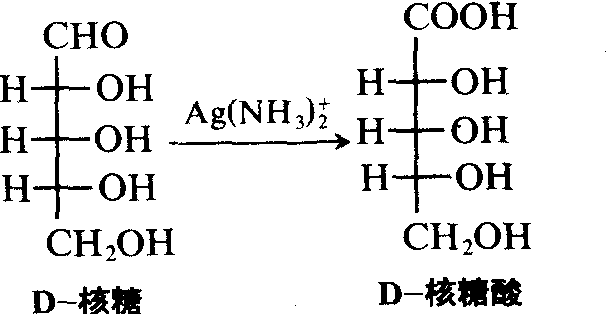 天然核糖为D-构型。分子中的3个手性碳原子的构型均为R-型。D-核糖具有醛糖的通性,可以被溴水、银氨溶液、氢氧化铜等氧化为核糖酸: