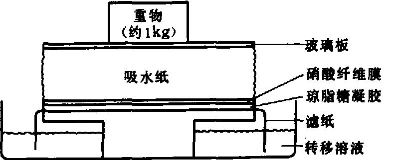 图 1 索森(Southern)印迹的基本装置 诺森印迹法 类似于索森印迹法。其命名不是创始者的姓名,而是巧用南、北两个方向命名,将 DNA和RNA的分析法区分开来,由索森法引伸出来的名称。它是将RNA分子用琼脂糖或聚丙烯酰胺凝胶电泳分离再吸印到硝酸纤维膜 (或重氮𦭌甲基; DBM纤维膜)上,因RNA是单链分子,所以不用变性,直接与单链核酸分子探针杂交。 染色体原位杂交 也是固相杂交的一种形式。这一技术用来确定某一“目的”DNA顺序在完整染色体上的位置。操作时,将染色体固定在载玻片上,并经过处理除去RNA和蛋白质,使染色体DNA变性,在原来的位置上与核酸探针进行杂交。这一技术首次应用在确定rDNA在核仁组织中心的位置。现已应用于基因的定位。 菌落原位杂交 是原位杂交技术的另一种形式。通常应用于确定带有重组分子的细菌菌落中与探针同源的外源DNA插入片段。细菌菌落首先从培养皿上转移到硝酸纤维膜上,经过细胞裂解,DNA释放,变性和固定后与探针杂交。另一相似的技术是噬菌斑原位杂交,不同的是印迹在硝酸纤维膜上的是噬菌体而不是菌落。这些技术专门用来从基因文库或cDNA文库中筛选与探针同源的重组子。 R-环技术 也是检测核酸杂交的技术。杂交后的分子可以直接在电子显微镜下显示出特定的构象。在双链DNA分子部分变性的情况下,单链的 RNA分子与相应的DNA分子中的一条链互补形成RNA-DNA杂种分子,同时另一条DNA单链向外突出形成环状图象,称之为R-环,该技术由此得名。在电镜图象中,双链区比单链区线条粗,很易分辨。真核生物成熟的mRNA分子与其DNA分子杂交,由于内含子顺序不与mRNA互补而形成R-环,所以可用来研究真核生物基因的结构,根据R-环的数目可确定内含子的数目(图2)。
