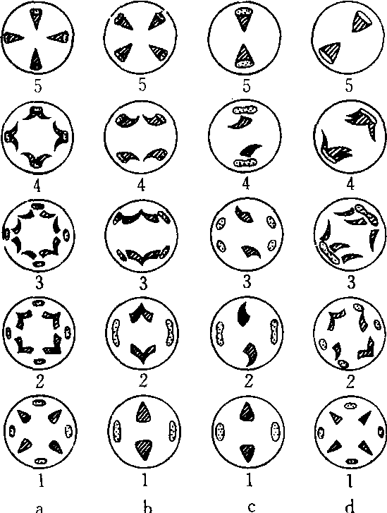 根、茎过渡区的类型 a 型:川续断属、紫茉莉属、紫堇属 b型:槭属、南瓜属、菜豆属及金莲花属 c型:苜蓿属、山黧豆属、海枣属 d型:某些单子叶植物如知母属 1.根 2~4.表示连续生长中维管束的分离、旋转与靠合的转变 5.茎(图中斜线部分为木质部,黑点部分为韧皮部) |