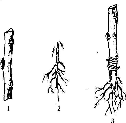 图 2 装根接(插2个小根段的装根嫁接) 1. 接穗; 2. 根段; 3、4.接后包扎状 根接植物嫁接方式之一。即利用树根作砧木嫁接。常用的有枝接根和树接根两种。前者采用适当粗细的一段根作为砧木,与接穗相互接合;后者利用苗木的根系接在成年树主干基部,以更新成年树根部枯死和衰老的部分。 根接root grafting用根系为砧木的嫁接法。有用根系嫁接和根系的一小段根嫁接两种方法。切削方法前者可用劈接法,后者用腹接法(又称倒根接法),嫁接后再栽入苗圃中育苗。用于难以获得砧木的植物或根接容易成活的植物,常用于桑树,果树中的仁果类、核果类,观赏植物中的牡丹、西洋石楠花、蔷薇等多种植物的繁殖。 |