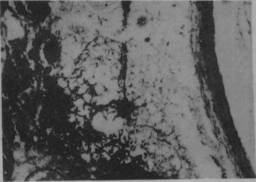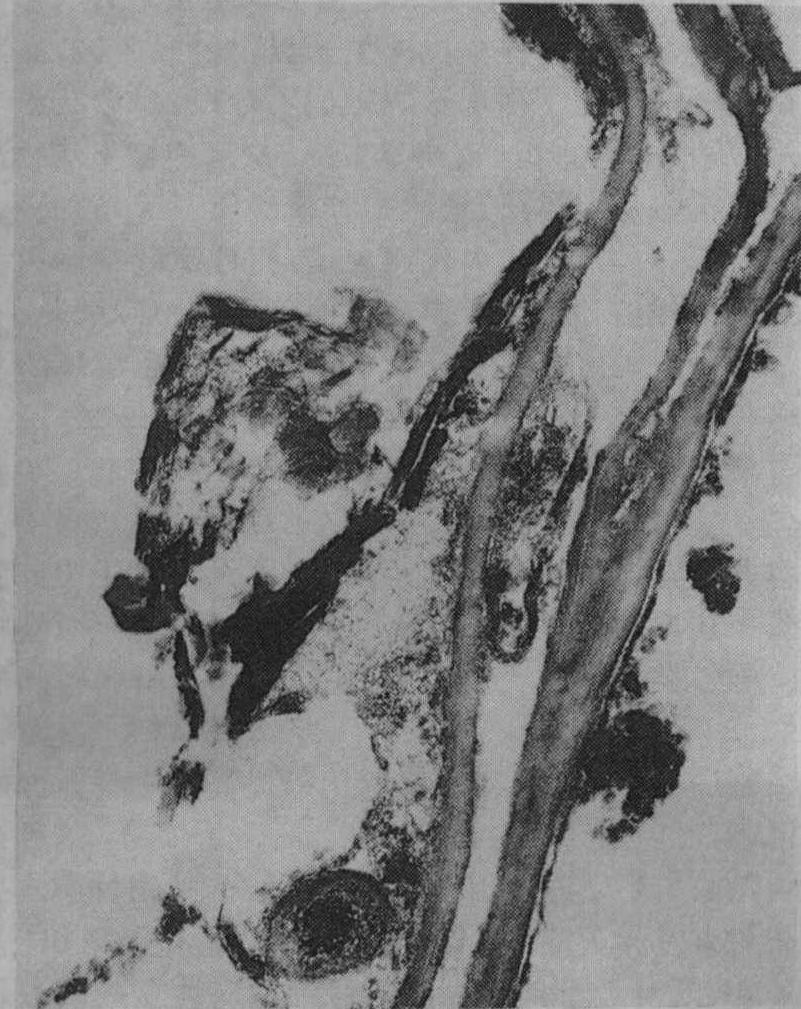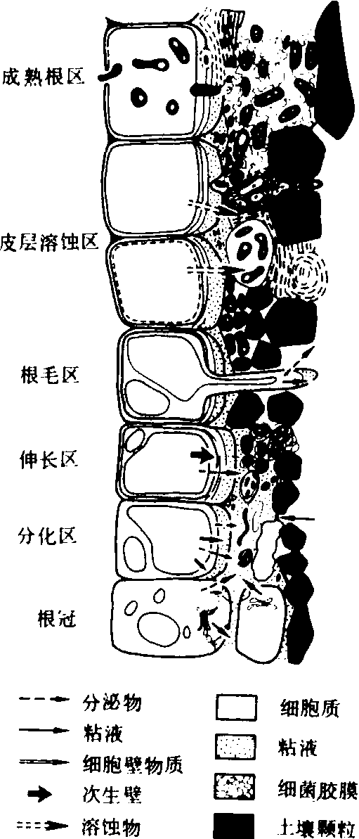 根毛区的根毛尖端可分泌粘液,根毛迅速的更新和降解,使新生根毛被粘液所包围。当根毛伸入土壤颗粒中,在土壤和根毛之间有粘液层相隔,在根毛的尖端和基部聚集有大量的细菌、放线菌,一些菌根菌的菌丝体通常从这里穿入根毛进入根组织。 幼龄成熟根区的表皮细胞受土壤的机械损伤和微生物的溶解作用,促使细胞溢泌量增加,这些溢泌物与细胞溶解产物混合,成为细菌和其它微生物生存和繁殖的天然培养基。在这一根区的粘液层中微生物的种类和数量最多,代谢活动也最为活跃。而老龄成熟根区内由于大量微生物繁殖和产生溶胞酶的溶蚀作用,使粘液层完全消失或残缺不全。部分表皮层和皮层组织的细胞壁被分解,细胞质消失,出现多层细胞叠挤的现象。细胞空腔中可见到细菌群落和土壤颗粒(图2),根组织实际上已与根际土壤直接沟通,形成内根际(en-dorhizosphere)。 不同生理年龄根区的显微特征指出,植物根与土壤并非直接接触,主要吸收根部位均存在来源不同和厚薄不等的粘液层介于根一土之间。粘液向外渗入土壤空隙之间,数量上由多到少形成粘液-土壤过渡层(图3)。在其界面上吸引了一些分散的土壤粘粒碎片,这些碎片均以其长轴与根表面呈平行方向排列,这表明,粘液是一种带电荷的有机胶体,通过与粘粒碎片的静电力场,导致这种定向排列。粘液层不仅起着根与土壤的连接作用,而且也是水分和养分传递的通道。由于植物种类和土壤条件的差异,粘液的组成分也有千差万别,优势微生物的种群也随之不同,这在一定程度上反映了植物的遗传特性。