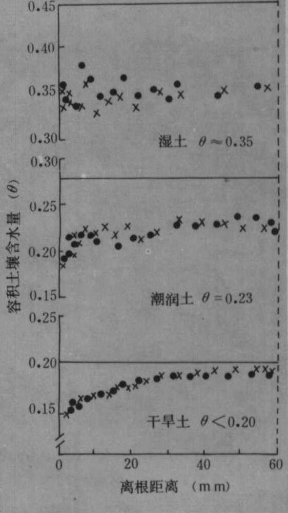 图3 粘液-土壤过渡层 物理特征 根际内的水分状况取决于土壤中水分的流速、植物根系的吸水速率和单位土体中根系的总长度。根表面水分流量的最高值为每天每平方厘米1立方厘米,相当于每天单位厘米根长吸收0.1立方厘米水。在湿润土壤上,水流速度约为单位面积0.2×10-6立方厘米。因此,在土壤含水量较低时距根5毫米的根际土壤中出现水分亏缺梯度;潮润土壤上水分亏缺区仅在根周围,2毫米以外即不明显;湿土上则不存在水分亏缺区(图4)。