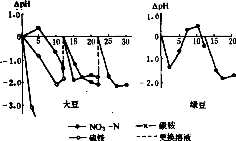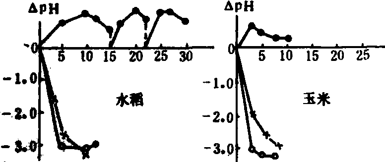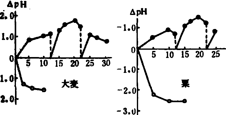 在一定范围内水分亏缺区的存在可增加根际内水分的流速,其线型速率可超过每秒1.7×10-6厘米。因此,也有利于质流过程中养分向根的运输。当然,在亏缺达到水分胁迫的临界值以上时,将引起粘液层收缩,影响根与土壤接触,从而降低根际中养分的溶解和运输。 由于根系通常沿着土壤孔隙伸展,在一般情况下土壤孔隙比根直径要小。因而根际土壤存在紧实效应。这种紧实压在根尖区的最大值可达9~13×105帕。但实际上受根挤压的土壤范围很小,通常只是紧靠根表的周围土壤。应用穿透计曾测出,小麦根尖周围粉砂壤土的容重由1.4增加到1.5。壤土上豌豆根附近容重由1.5提高到1.55。在粘土上豌豆根周围0.5~1.5毫米内土壤的孔隙比由1.19下降至1.09,5毫米以外则差异不明显。 根际土壤的容重增加将伴随气体中含氧量减少,当降至10%以下时则明显影响根的生长和生理代谢过程。 化学特征 根际的化学特征包括酸碱度、氧化还原状况的变化、养分的亏缺和累积,以及养分的络合、溶解等化学过程。 pH值 反映酸碱度的量值。根际的氢离子浓度通常与原土体有明显的差别。这是由于根系分泌H+或HCO-3(OH-),以及起因于植物吸收阴离子的比例不同,而有密切关系。其中氮素形态、某些养分缺乏均可诱导根际pH值的变化。 各类作物根系对硝态氮和铵态氮的吸收都是很迅速的。当两种形态的氮共存于生长介质中,由于铵态氮对硝酸还原酶的抑制作用,作物通常优先吸收铵态氮,然后吸收硝态氮。因此,根际会出现pH值先下降,再上升的过程。而铵态氮或硝态氮分别作为唯一氮源施用时,铵态氮将引起作物pH值明显下降;硝态氮则上升。这种变化趋势在大多数植物种类中都相似,禾谷类作物的这种变化规律更为显著(图5)。但在豆科作物中则有所不同,吸收硝态氮也出现pH值下降。这主要是因为豆科植物在共生固氮中释放出质子,以及硝酸还原酶作用的位置主要在地上部的叶片中,根组织内不致因游离硝酸离子引起阴阳离子不平衡而使pH值上升。