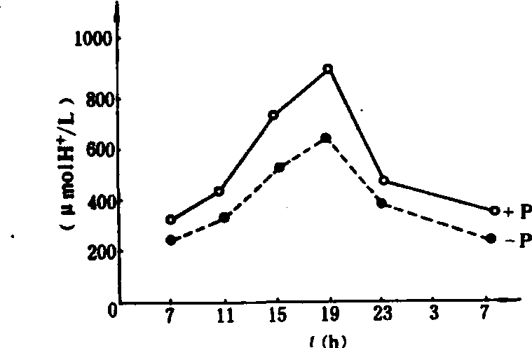 图5 氮素形态对根系介质pH值的影响 稻、麦、油菜、豆类等作物的根际pH值随供磷水平下降而显著降低,并有明显的昼夜变化(图6)。强光照下更为敏感,表明根际pH值与磷水平的关系是与光照影响磷同化能力相联系。当供磷不足时,稻、麦根际酸化的部位主要在根尖4厘米以上的吸收区,而羽扇豆在低磷条件下局部形成短的不定根,呈串状簇生根。这类根周围的pH值明显下降。缺磷逆境下作物还诱导有机酸从根溢泌,根际中柠檬酸量显著增加。表明,磷不足时,植物体内代谢失调,使柠檬酸在体内相对积累而外溢。因此,磷逆境条件下通过根际酸化,有利于土壤中难溶性磷部分溶解,由此提高土壤磷的利用率。