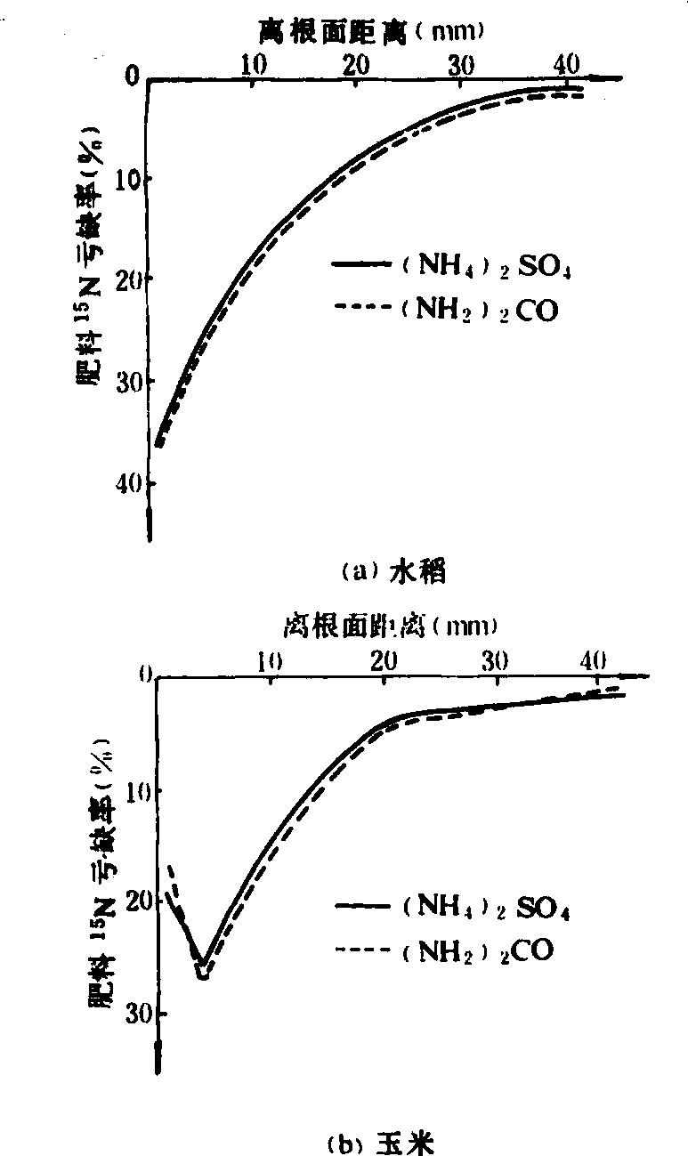 大量元素的缺乏,尤其是氮和钾的缺乏,对根际氧化还原状况的影响很大。缺氮水稻根际的Eh值比正常条件要低21%~55%;缺钾时则下降63%~72%。因此,缺钾土壤上施用钾肥可以显著地改善根际的氧化还原状况。 养分 根际养分通常出现养分的亏缺或累积,并且通常是随离根距离呈梯度变化。 根际中的氮素,主要是当季新加入的铵态氮肥料,呈现亏缺梯度;而全氮的差异不显著。不论是硫铵、碳铵和尿素,离根1毫米的土壤中亏缺率可达30%~70%,并随离根表面的距离呈指数曲线的变化。亏缺范围在10毫米以内梯度最大,表明这一范围是氮素供应的主要部位。旱作与水稻亏缺曲线上有所不同,NH4-N在根际的最大亏缺区处于离根1~2毫米之外,0~2毫米内存在相对累积区(图7)。近根的这种相对累积,经证明是由于根系向外溢泌的分泌物中含有的氮,以及根毛等脱落组织所产生的结果。而水稻的分泌物和脱落物均低于旱作,因而这种根周围相对累积现象不明显。