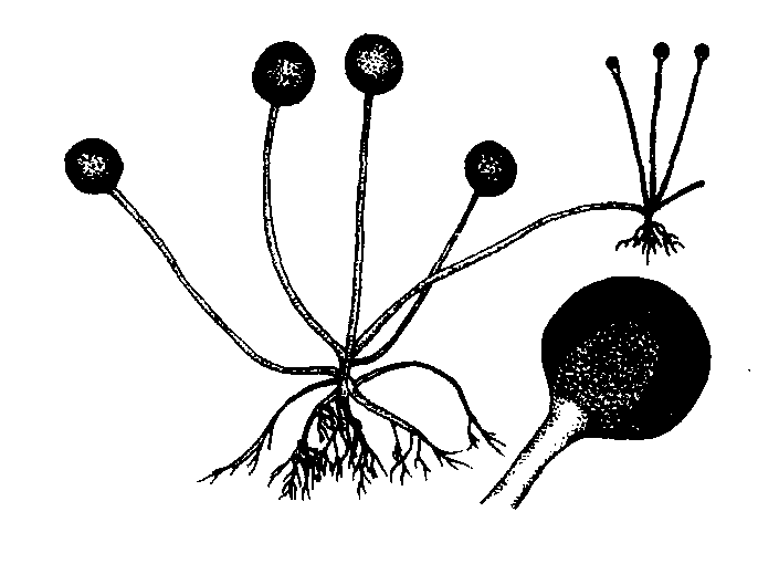 匍枝根霉 1.两簇孢子囊在假根上生出 2.放大的孢子囊,内有囊轴和孢子 |