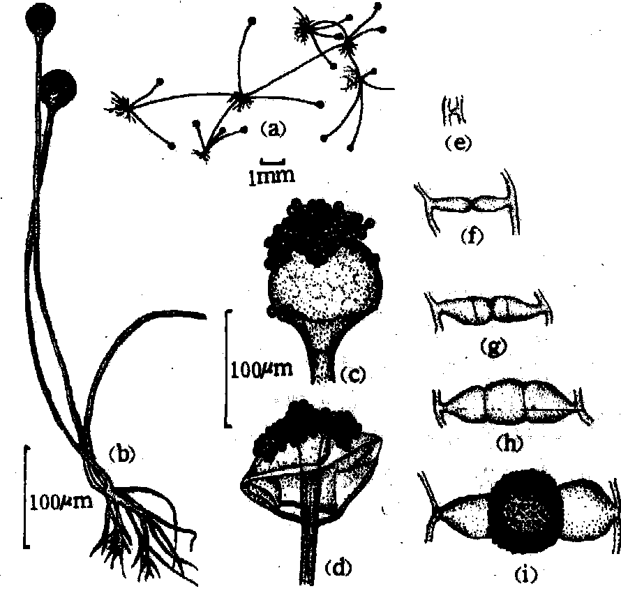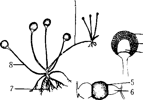 根霉属 1.匍匐丝 2. 孢子囊 3. 孢囊孢子4. 囊轴 5.接合孢子 6. 配子囊柄 7.假根 8. 孢囊梗 |