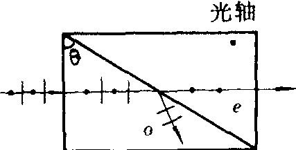 光轴 要使棱镜能在紫外光区使用,可用甘油或矿物油粘合。也可不粘合,即两棱镜之间为空气层,这就是格兰—傅科棱镜。要让o光在棱镜和空气的界面仍发生全反射,而e光不全反射,棱镜的顶角应满足(1/ne)>sinθ>(1/no),对方解石,即42°>θ>37°。使用这种棱镜时,入射光束的最大功率密度可达100瓦/厘米2,但是这种棱镜中的两个直角棱镜的定位较为困难,而且入射光束的孔径角也较小。 |