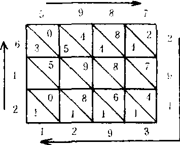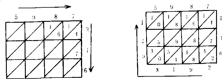 一种乘法,最早见于印度数学家婆什迦罗的名著《丽罗娃提》(1150)。例如要计算5 987×216, 如下左图画好格子, 将被乘数自左向右写在顶上,将乘数自上至下写在右边,再将两数每一位的两两乘积写在相应的小格里, 每个小格左上部为乘积的十位数,右下为乘积的个位数。再如下右图自右下角沿斜行将上述乘积相加,直到左上角,于是得到正确的结果5 987×216=1 293 192。