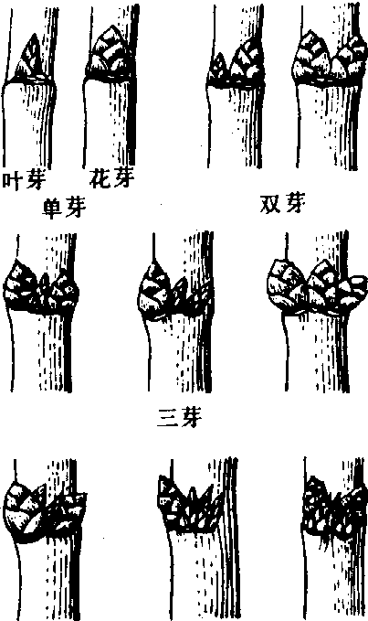 桃 树 的 芽 芽分叶芽和花芽两类。花芽为纯花芽, 着生于新梢叶腋间。新梢顶芽一般都是叶芽。芽有单芽和复芽,单芽可以是花芽或叶芽,而常见的复芽为一花芽和一叶芽并生的双芽和双侧花芽、中间叶芽的三芽并生(见图)。复花芽多, 着生节位低, 易获丰产。叶芽的萌发力和成枝力均强,若第二年不萌发, 则多数枯死。潜伏芽寿命较长,多用来更新老树。 枝条分生长枝和结果枝两类。生长枝按其生长强弱分为徒长枝、发育枝和叶丛枝, 前两种主要是形成树冠骨干; 结果枝按长度可分为徒长性果枝、长果枝、中果枝、短果枝和花束状果枝。徒长性果枝结果后仍能萌发较强新梢, 连续结果或更新和形成结果枝组; 短果枝和花束状果枝停止生长早,花芽饱满,果大, 但发枝力弱, 易于衰亡。一般南方品种群多以长果枝结果为主,北方品种群多以短果枝结果为主;幼树和初结果树以长果枝和徒长性果枝居多数, 老树及弱树以短果枝和花束状果枝为主。桃芽为早熟性, 生长旺的枝在主梢迅速生长同时,侧芽萌发形成副梢,副>梢能再萌发副梢, 形成多次副梢。早期副梢亦能形成花芽, 翌年开花结果。 物候期 桃的物候期因地区和品种而异。❶萌芽期。北京于4月上旬萌芽。陕西武功于3月中、下旬萌芽。品种间最早最晚相差约5~6天。 ❷开花期。北京于4月中旬开花, 陕西武功于4月上旬开花。但云南呈贡盛花期在2月中下旬,而黑龙江齐齐哈尔在5月下旬,两地相差近100天。开花期平均气温约在10℃以上, 适温为12~14℃, 柱头保持受粉时间一般为4~5天, 完成受精为10~14天。 ❸果实成熟期。桃品种一般分早、中、晚熟3类,早熟品种在7月上中旬以前,中熟品种在8月、晚熟品种在9月以后成熟。山东齐河四半桃6月上旬成熟, 陕西商县冬桃则11月至12月成熟。桃果发育分3个时期, 第一期从子房膨大到果核木质化前, 纵径比横径增长快, 果实体积和重量迅速增加; 第二期为硬核期, 生长缓慢, 特别是晚熟品种持续时间6~7个星期或更长; 第三期为果实第二次迅速增长期, 果肉厚度迅速增加, 横径超过纵径, 增重明显。油桃则不同, 有些品种第二、三期都处于渐增状态。 ❹花芽分化期。河南郑州早生水蜜桃7月中下旬花芽分化始期, 8月上旬萼片分化期, 8月中旬花瓣分化期和雄蕊分化期, 8月下旬雌蕊分化期, 9月下旬形成柱头和子房, 12月上旬花粉母细胞形成, 12月下旬柱头和子房膨大, 花丝伸长, 翌年2月上中旬花粉母细胞开始减数分裂, 花丝和花柱继续增长,3月上旬单核花粉粒与胚珠形成, 3月下旬开花。 ❺落叶期。北京一般在10月中旬开始落叶,品种间稍有差异。 对环境条件的要求 桃对气候条件要求不严, 除极热极冷地区外均可栽培, 但以冷凉温和气候生长最佳。冬季严寒和春季晚霜是桃栽培的限制因子, 一般品种在-22~-25℃可能发生冻害, 但在黑龙江和新疆北部用匍匐栽培、冬季埋土防寒, 即使达-34℃的地区也能生长;桃花芽萌动后-1.7~-6.6℃即受冻,开花期-1~-2℃、幼果期-1.1℃受冻。 桃于春季能够正常萌芽和开花, 需要冬季温度在7.2℃以下500~1 000小时或更多,称为需冷量。在南方, 由于不能满足需冷量要求而出现萌芽、开花和结果的异常现象, 如广东栽培白凤、玉露等品种, 由于需冷量不足, 开花延至5月, 有时花芽不膨大即行脱落; 但有少数品种需冷量在100小时以内,可在南方栽培。 桃的生长适温为18~23℃,果实成熟适温24.5℃;温度过高, 果顶先熟, 味淡, 品质下降, 枝干也易灼伤。夏季土温高于26℃, 新根生长不良。 桃喜光,对光照反应敏感。光照不足, 枝叶徒长,花芽分化少、质量差, 落花落果多, 果实品质差, 内部小枝迅速枯死, 结果部位上升外移。相反, 夏季直射光过强, 枝干易日灼, 影响树势, 故内膛大枝需有枝叶保护。 桃耐旱忌涝, 根系好氧性强, 适宜土质疏松排水良好的沙质壤土。过于粘重和肥沃土壤, 容易徒长和患流胶病。在微酸和微碱性土壤中都能生长, pH 4.5以下和7.5以上生长不良。在碱性土中易发生黄叶病;含盐量高于0.28%会导致植株死亡。在种胚形成期、果实膨大期和花芽分化期需水较多, 北方早春、南方伏旱均应及时灌水。 主要品种和类型 桃品种很多,全世界约有3 000个以上,中国有800个左右, 依其生态条件分为5个品种群。 北方品种群, 主要分布在黄河流域、西北和东北等地, 以甘肃、陕西、河北、山西、山东、河南等省栽培最多。树冠较直立, 果实带尖顶, 肉质较硬、致密, 较耐贮运, 有较强的抗寒和抗旱特性, 但不耐暖湿气候, 移至南方栽培往往生育不良, 抗病性差, 产量低。按肉质又可分为3个亚群: ❶蜜桃亚群。果大,肉韧多汁, 多为白色, 含糖量高, 品质优、粘核, 适于鲜食和加工。著名品种有肥城桃、深州蜜桃等。 ❷脆桃亚群。肉质脆嫩多汁, 离核或半离核, 早熟, 如五月鲜等。 ❸面桃亚群。果顶尖突, 肉松绵少, 离核, 成熟较早, 不耐贮运。如四月白等。 南方品种群, 主要分布在长江流域, 以江苏、浙江、云南等省栽培最多。适于温暖多雨气候, 有些品种也适于北方栽培。树冠较开张, 复花芽多, 果顶平圆或微凹,耐寒、耐旱性较差。按肉质又可分为2个亚群: ❶水蜜桃亚群。果肉柔软多汁,易剥皮, 多粘核,不耐贮运。如玉露、白凤等。 ❷硬肉桃亚群。树冠较直立,单花芽多,果顶微尖, 肉质硬脆致密, 过熟则变粉绵, 汁较少, 较耐贮运, 多离核。如吊枝白、
