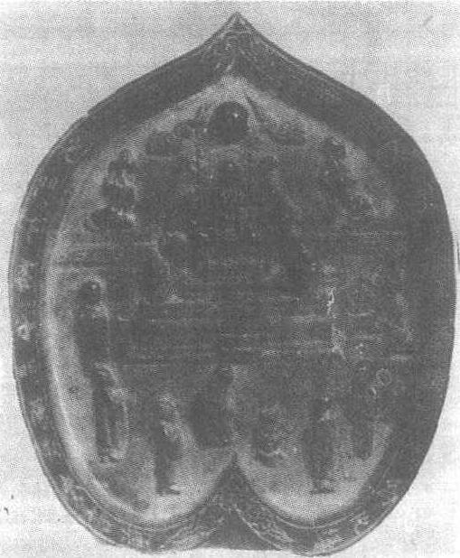 | 释义 | 桃形说法铜镜宋。高20厘米,横宽16厘米,边厚0.7厘米,钮径1厘米,孔径0.5厘米,边沿宽1.2厘米。重1175克。1987年四川省丹棱县唐河乡龙鹄村出土。四川省丹棱县博物馆藏。铜镜形如桃形,镜面光洁平整,色黑发亮,光可鉴人。镜背中有一半球形钮,钮有一小孔,为系绳或支撑镜体之用。钮孔两侧饰对称流云纹,祥云之下须弥座上雕有台阶、梯步和走廊,宝座之上端坐有说法者释迦牟尼。环绕宝座有菩萨、圣僧、供养人物及鼓乐手等十躯人物。这些人物有拱手打揖的,有双手合十的,有击鼓奏乐的,有听佛说法的,人物造型生动活泼,布局合理。宝座前侧雕一雄狮。桃形镜边有凸起的边框,上下各有刻云纹一朵,中间有楷书铭文:“敲床坚佛对人天,应接随机为化缘,若是饮光门下客,分明荐取求了前”共计28字。