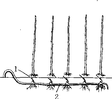 图1 以苗育苗压条法 1.箭头示冬季切断苗木部位 2.留在土中的老条
