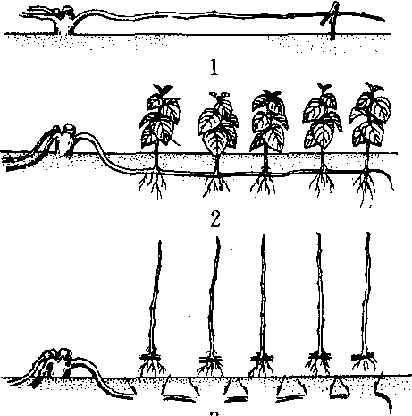 图2 丁字形压条法 1.压条前的伏条 2.压条后的生长情况 3.起苗 |