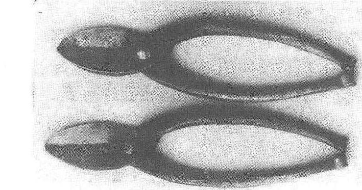 图1 小桑剪 桑斧 是山东、河北一带的砍伐高干桑枝条的工具。斧形较小,斧刃长5~6厘米,宽6厘米,装有木柄,刃口锋利,可自上而下砍伐桑条。 接桑刀 是桑树袋接法育苗时,切削接穗的工具。刀身长约10厘米,刀口略呈弧形,装有木柄,刃口为优质钢,很锋利(图2)。