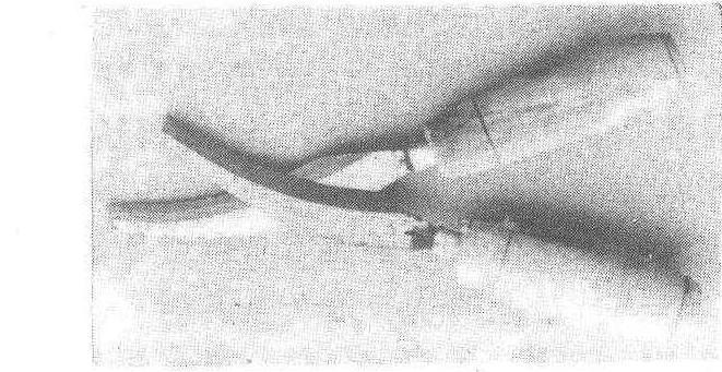 图2 接桑刀 摘桑刀(摘桑器) 是夏秋蚕期采摘桑叶的工具。以薄钢片作刀片,刀上装有铁丝绕成的指圈,以便套在食指上采摘桑叶,采摘时在叶柄中部切取叶片,部分叶柄残留在枝条上,可以保护腋芽不受损伤(图3)。
