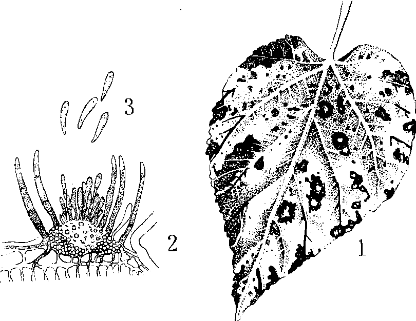 病原 桑炭疽病的病原菌为桑叶刺盘孢菌,黑盘孢目,黑盘孢科,刺盘孢属,学名为 Colletotrichummorifolium Hara。病斑部褐色小点,即病原菌的分生孢子盘,散生呈环状排列。分生孢子盘始生于表皮下,成熟时突破寄主叶面表皮外露。分生孢子盘直径55~300微米,在分生孢子盘上生有暗褐色刚毛。刚毛基部较粗,有1~4个隔膜,长宽为35~110×4~5微米。分生孢子盘上丛生分生孢子硬,短线状,无色,单胞,长宽为5~7×2.5~3.5微米。梗上着生具有胶粘物的分生孢子,分生孢子镰刀形,无色,单胞,长宽为20~40×3~5微米。 侵染 本病以分生孢子盘及菌丝体在被害叶片上越冬,若病叶在越冬期间没有腐烂,则到明年能从分生孢子盘上再产生分生孢子,引起初次侵染。从病菌侵入至出现病斑约经10日左右,潜育期的长短与大气湿度有密切关系。一般于7月间病斑上产生新的分生孢子,又引起再侵染而发病为害,8、9月后病势加剧,直至落叶为止。在发病季节,雨量多时易引起病害流行。冬季气候潮湿,病叶腐烂,越冬菌源减少,发病减轻。本病发生与桑品种有关,鲁桑发病较多,湖桑7号、育2号、湖桑32号较易感病; 湖桑199号、湖桑197号、新一之赖等品种发病较轻。 病症 桑叶初发病时,叶面上散生黄色乃至黄褐色不清晰的小病斑,随着病斑扩大,色泽加深为赤褐至暗褐色,带圆形,中心灰黄色,外圈红褐色,中间橙红色,病斑发生于叶脉附近,以后扩大呈赤褐色不规则病斑。严重时,大小病斑连片,叶缘及叶片干枯状,枯叶的叶柄变红,早落,有些叶片干枯后,叶缘也带红褐色。 防治 注意收集病叶及时烧毁,可消灭越冬病菌。发病季节用70%托布津1,000~1,500倍液或25%多菌灵1,000~1,500倍液喷布桑叶,对蚕无毒害。桑园冬耕,翻埋病叶于土下,以减少次年菌源。 桑炭疽病桑树叶部病害,属真菌病类。江浙蚕区发生较普遍。本病一般7月间开始发生,叶片枯黄,提早硬化。影响秋蚕饲育。发病初期,叶上散生黄褐色或红褐色不清晰小点,后扩大呈暗红色不规律圆形病斑,严重时,多数病斑连接形成不规则大枯斑,病斑正反面散生由棕褐色到黑色疹状小颗粒,终至全叶枯焦。防治方法:1.消灭桑园越冬病原。2.发病期喷药抑制。用70%托布津可湿性粉1000—1500倍液或25%多菌灵可湿性粉1000—1500倍液喷布桑叶(无残毒)。3.夏伐后,用波美4—5度石硫合剂或25%多菌灵800倍液进行树体消毒。 桑炭疽病anthracnose桑树叶部病害之一。分布于江苏、浙江、江西、安徽、山东、湖南、四川、台湾等省;日本也有分布。感病后叶片出现不规则形或近圆形暗红色病斑,叶脉鲜红,病斑上散生棕褐色到黑色的小粒点,病斑扩大连在一起,则叶片枯焦。病原为半知菌亚门腔孢纲黑盘孢目黑盘孢科毛盘孢属的真菌Colletotrichum morifolium Hara,以菌丝体及分生孢子盘在病叶上越冬,次年产生分生孢子引起侵染。宜采用消除病叶;发病季节以70%托布津或25%多菌灵1000倍液喷布桑叶等措施防治。 |