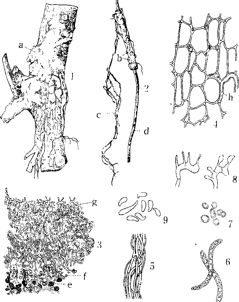 病症 此病的主要症状,在地下部及地际是先使根皮失去光泽,以后逐渐变成黑褐色,和健根的鲜黄色显然不同。病害后期使桑根皮层腐烂,但外部的木栓层和中间的木质部腐烂较难,结果皮层烂尽,剩下栓皮和木质部彼此完全脱离,栓皮象一个套子套在木质圆柱上。被害桑根的表面并缠绕有紫色的根形菌索,以后菌丝纠集成片,包绕在露出地面的树干基部,呈现紫色绒状菌膜,此菌膜在潮湿时,甚至能扩展到地面。于5、6月间在菌膜表面形成子实层,而微现粉质状,此即病菌的担子及担孢子。在腐朽的根部除菌索外,并生紫色的菌核。 防治 选栽无病苗木,对可疑的苗木进行消毒,进行轮作,在病地改种非寄主植物,加强肥培管理,使桑树生长良好,增强抗性,新辟桑园的土壤要进行检查,若有病菌存在,应进行病土消毒后,再种植桑苗。 桑紫纹羽病桑树根部主要病害,系真菌病类。初发病,病原菌首先入侵幼嫩新根,被害部位变黄褐色,随病势发展,根表层纠结细丝状紫红色菌丝束。并纵横交叉呈网状布满桑根后蔓延侧主根,病害部位腐烂,病苗极易被拔起,地上部分呈缺肥状,逐步衰弱,枝细叶小色黄,继而芽、叶枯萎,整株枯死。病株及带菌苗木往往春季不能发芽。幼龄树发病死亡通常历时2—3个月,也有1年左右的,树龄较大的可带菌生长10余年。防治方法:1.栽植选用无病苗木,对轻度嫌疑苗木用25%多菌灵500倍液浸根20—30分钟,45℃温水或0.3%漂白粉液浸根30分钟。2.土壤诊断。栽桑前,用新鲜桑枝或播种萝卜进行引菌检验,检查根部有无紫红色菌丝分布。3.例行检疫,防止病苗调运。4.严重发病桑园进行园地轮作。5.病土处理。局部发病土壤,用20%五氯硝基苯等消毒病土(在长1米消毒沟内用五氯硝基苯100克和碎土拌和消毒)。 桑紫纹羽病violet root rot又称烂蒲头、泥龙。桑树根部真菌病害。分布于江苏、浙江、安徽、河南、山东、河北、湖南,广东、台湾等省;日本和朝鲜半岛也有分布。被害桑根表面布满紫色的根状菌索,皮层腐烂。桑根受害后,树势衰弱,逐渐枯死。病原为担子菌亚门层菌纲木耳菌目木耳科卷担子菌属Heli-cobasidium mompa Tanaka,以菌索和菌核在病根和土中越冬越夏。主要依靠病根接触、水流及农具接触传染。发现病株及时挖除;用50%多菌灵每公顷75 kg土壤消毒,或与禾本科作物轮作均有防治效果。 |