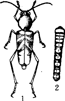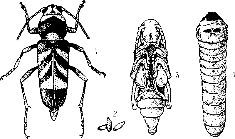 生活习性 在辽宁1~2年发生1代,以不同龄期的幼虫在枝干内越冬,次年4月上、中旬开始活动,以老熟幼虫越冬者,6月下旬至7月上旬为羽化高峰,羽化后不久即交尾产卵。幼虫孵化后蛀食到11月上旬越冬,第2年继续蛀食为害,至7月下旬至8月间羽化,完成1个世代需14个月。成虫再产卵孵化的幼虫,要越两个冬季,至第3年6月羽化,完成1个世代需22个月,即完成先后两个世代,需三年。世代重迭,在桑树生长发育期间,各虫态均有发生。成虫羽化后从原蛀入孔咬破表皮出孔,出孔后即行交尾,卵产在树干的缝隙、裂口内。成虫有较强的飞翔力,不再取食,但需饮水。卵期7~20天,孵化后幼虫沿形成层由上向下蛀食,每隔一段距离向外蛀一小米粒大小的通气孔,虫粪被树液稀释后成条状由通气孔排出堆积于树表,状如蚯蚓粪堆。幼虫老熟前蛀入木质部,形成“⌝”形隧道,以木屑堵住隧道上方,化蛹其中。蛹期13~28天,羽化为成虫。 分布为害 桑虎天牛分布中国、日本,中国各主要蚕区均有分布。寄生为桑树,以幼虫蛀食桑树枝干。被害桑轻则枝细叶薄,产量不高,重则全株枯死。 防治 加强桑园管理,以增强树势,减轻被害;捕捉成虫;刺杀和药杀幼虫。 桑虎天牛tiger longicorn beetleXylotrechus chinensis Chevroat,又称虎斑天牛。鞘翅目,天牛科。中国、日本各蚕区均有分布。成虫体长16~28 mm,黄褐色,前胸背板略呈球形,有黄、赤、黑色横带,鞘翅上有黑色和黄色相间的斜带。幼虫淡黄色,圆筒形,前胸硬皮板前缘左右及两侧各有一黄褐斑块。幼虫蛀食桑树皮层和木质部,一两年发生1代,以幼虫越冬。常用捕捉成虫;用20%灭蛀灵50倍液喷干等方法防治。