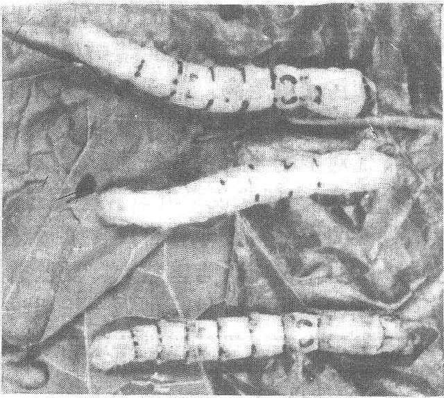 桑蚕吃食含氟桑叶,在小蚕期群体大小不匀、发育极其不齐、龄期显著延长,被害蚕体躯瘦小、体皮多皱、体色黄锈、胸部萎缩,行动不活泼,食欲骤减,甚至肠内空虚空头空身,眠前蚕体节间膜高起出现黑色环斑,大蚕被害个体体型差异虽小,但节间膜高起似脓病高节蚕,并在节间膜上出现由黑点联成的环状轮斑,极易皮破出血或吐水(见图)。解剖镜检被害蚕,并无传染性病变和病原,如切断污染源改喂正常桑叶,被害蚕的高节、环斑等症状会随蜕皮而消褪。拌随中毒发展如防病不严,末期多会并发传染性蚕病。硫化物污染桑经蚕吃下,表现行动不活泼,发育不齐,经过延缓,多呈软化症状。蚕吃氯化物污染桑后丧失食欲,吐浮丝、胃液。蚕吃粉尘污染桑后食欲下降,发育不良。