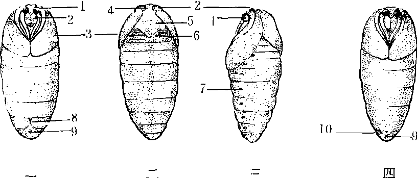 蛹 幼虫老熟时停止摄食,吐丝营茧,然后在茧内蜕皮化蛹。刚化蛹时,体壁柔软,呈乳白色,以后随发育而逐渐变硬体色也逐渐变黄,最后变成深褐色。蛹体纺锤形,也分头、胸、腹3部分。头部很小,顶端白色部分背方的小块称头顶,前方略呈长方形的白色部分称额,额的下方为唇基,唇基后方接上唇,上唇两侧可见有黑褐色已退化的上腭,下唇被下腭掩盖。额的两侧有一对向下弯曲的触角,其基部下方有一对复眼,复眼在刚化蛹时无色,随蛹的发育逐渐变为褐色,近化蛾时成黑褐色,根据眼色的变化,可以知道蛹龄和预测化蛾时期。胸部由3个环节组成,分称前胸、中胸、后胸。各环节腹面均有一对胸足,紧贴胸部腹面,中胸和后胸各有一对翅,后翅被前翅复盖,并包向胸部腹面盖住了部分胸足。腹部由9个环节组成,以第4、5、6三个腹节较大,第4、5、6、7腹节之间可转动,特称可动环节。在前胸和第1~7腹节两侧各有