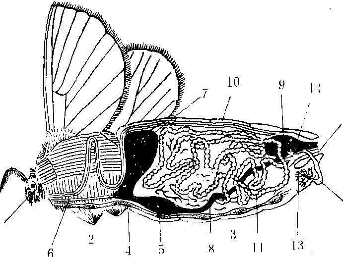 蚕体外面包被着具有着生肌肉、保持体形作用的体壁,其内方形成了体腔,所有内部组织、器官均浸浴在血液中,故体腔又称血腔。剖开蚕体观察,可见有一个长圆筒形的消化管从头部到尾部纵贯体腔中央,营消化、吸收和排粪等作用,消化管的后方两侧,各有3条淡黄色细长管沿消化管壁向前延伸,至消化管中部折回,后方形成许多屈曲,最后进入直肠壁,这是蚕的泌尿器官(又称马氏管)。消化管的腹侧方有一对半透明的屈曲纵走腺体,是丝腺。丝腺体在小蚕期很小,到5龄期才显著增大。沿腹中线近体壁处有一条有节的索,称神经索。其上的节称神经节,从各神经节分出神经分布到蚕体的各器官组织。在消化管两侧各有一条沿体壁纵走的黑褐色细管,以及由此分出的许多分枝,分布于体内各部,是专司呼吸作用的气管系统。在体壁背中线的下方,从头部到第9腹节有一条由薄膜构成的背管,起心脏和大动脉的作用,司血液的循环。在第5腹节背管两侧有一对白色的生殖腺,雄的呈肾脏形,称睾丸;雌的呈三角形,称卵巢。各分出一条生殖导管,雌的后端附着于第7腹节后缘体壁内面,雄的连接在生殖芽前端的两侧。体壁内面着生有各种肌肉,借以运动和固定内部器官组织的位置。在体壁下面及各器官间的体腔内分布有白色片状和带状的脂肪体,是合成和贮藏蛋白质、脂肪、糖原的器官(图7)。