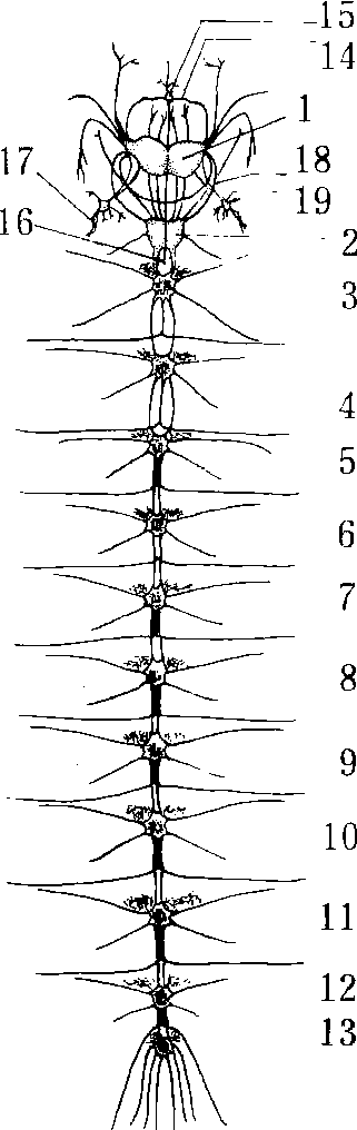 壁处。幼虫中枢神经有13对神经节,其中头部2对、胸部3对、腹部8对。成虫中枢神经在头部和胸部的神经节与幼虫相似,其特点是,第1对神经节即脑特别发达,咽侧神经索缩短,因而第2对神经节距离很近,中间仅有一小孔通过食道和背血管。成虫胸部第1神经节接近第2神经节,而第2、第3神经节又相互紧密结合成瓢形(图1)。 外周神经 由中枢神经系统发向蚕体周缘各器官组织的神经,包括由神经节到反应器的传出神经和由感受器到中怄的传入神经。 幼虫外周神经幼虫头部外周神经由脑的两侧各分出4条神经。其中除位于内侧的1对伸向脑的前方与额神经节相连的额神经外,其余3对分别伸向上唇、触角和单眼,相应称为上唇神经、触角神经和视觉神经。咽下神经节的前端左右各分出3条神经,分别分布于下腭、上腭和下唇; 在咽下神经节后端两侧各分出1条神经,向后延伸至第1胸节,分布在背血管的两侧。胸腹部的外周神经,除最后神经节外,各神经节的前后两端各向左右伸出两条神经,分布在背肌和体壁及腹肌的内层; 后端分出的神经分布到腹肌的外层及跗肢。最后神经节是复合神经节,后部从两侧发出3对神经。 成虫外周神经 成虫由脑分出的3对外周神经,分别分布至复眼、触角和上唇。从第2神经节向前发出的3对神经,分布到口器的上腭、下腭和下唇。胸部各神经节的前后两端各发出1对神经,分别分布到各自环节的足和翅。腹部第1神经节与胸部第3神经节之间的神经索,发出2对神经,分布在腹部第1、2环节中。从腹部第1、2、3神经节各发出2对神经,分布在各环节的背肌和腹肌上。腹部第4神经节发出的神经分布在腹部第6及以后环节的肌肉和生殖器上(图2)。