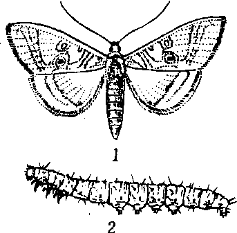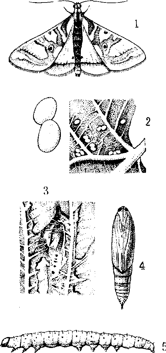 生活习性 江苏、浙江、四川一带一年发生4~5代,山东3~4代,广东8~10代,台湾发生10代,均以老熟幼虫在树孔裂隙中结茧越冬。第2年春末化蛹再羽化。卵多产在枝顶1~9叶的背面,沿叶脉一处产卵2~3粒,一头雌虫平均产卵186粒,卵期一般5~6天。6月中、下旬起,各代幼虫陆续为害桑叶,初孵幼虫伏在叶背的叶脉分叉处,取食叶的下表皮及绿色组织,仅剩上表皮,远看透明状,故俗称“开天窗”。3龄后吐丝折叶,伏内取食。往往吃光一叶又移到它叶,全株吃光则吐丝下垂,随风飘至邻株,继续为害。老熟后即在折叶或重迭叶内隐伏结茧化蛹。最后1代的幼虫越冬时,如尚未成长老熟,则虽也能结薄茧蛰伏,但大多数夭亡。 分布为害 桑螟分布中国、日本、朝鲜、印度、缅甸、斯里兰卡。夏秋季节,各代幼虫为害桑叶在9~10月间,往往导致整片桑株叶枯色黄,影响秋蚕饲养。另外,桑螟排泄物污染叶片,还易诱发蚕病。桑螟除为害桑外,尚未发现其它寄主。 防治 夏秋季利用灯光诱杀成虫,摘去虫叶、捏死幼虫。冬季提倡桑树枝捆结成束,以诱集越冬幼虫便于消灭。未卷叶前喷用90%晶体敌百虫5,000倍液,已卷叶时用3,000倍液喷布,均有效果。 桑螟俗称“油虫”、“青虫”、“卷叶虫”。鳞翅目,螟蛾科。年发生4—5代,是为害桑叶的害虫之一。幼虫食叶肉、下表皮,5龄后吐丝折叶潜入叶内食害。初孵幼虫淡绿色,密生细毛,成长幼虫长达24毫米,头淡赭色,胸腹部淡绿色,背线深绿色,胸腹部有黑色毛片,毛片上着生1—2根刚毛,越冬幼虫体淡红色。防治方法:1.束草诱杀越冬幼虫,2.修剪虫枝,用石灰或粘土填补树穴裂缝,3.灯光诱杀成虫。4.用80%敌敌畏乳油2000倍液或90%晶体敌百虫3000倍液喷杀幼虫。 桑螟mulberry pyralidDiaphania pyloalis Walker,又称青虫、油虫、卷叶虫。鳞翅目,螟蛾科。分布于中国、日本、朝鲜、韩国、印度、缅甸、斯里兰卡。已知仅为害桑树。成虫体长约10 mm,翅白色,带紫色闪光,前翅有五条浅茶褐色横带,后翅沿外缘有宽阔的茶褐色带。卵呈不规则扁圆形,为水绿色。成长幼虫体长约24 mm,为水绿色,越冬期变成淡红色。幼虫食害桑叶,一年发生2~10代,均以末龄幼虫越冬。常用束草诱杀,或用80%敌敌畏或50%辛硫磷、90%敌百虫1500倍液喷治。