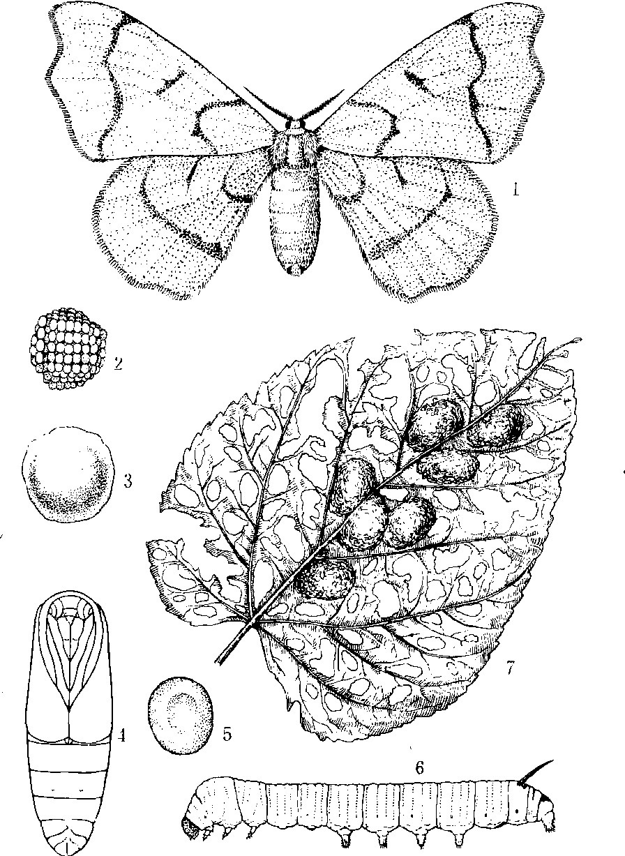 生活习性 桑蟥有1化性、2化性、3化性,均以有盖卵块在枝干上越冬。在江苏、浙江以2化性居多,因此第2代幼虫为害最重。一般每年6月下旬盛孵化,为第1代幼虫称头蟥、至7月下旬羽化产卵。此时1化性蛾即产有盖卵块越冬,而2化性、3化性蛾则产无盖卵块,于8月上旬孵化为第2代幼虫,称2蟥,至9月上旬羽化产卵。此时2化性蛾产有盖卵块越冬,而少数3化性蛾仍产无盖卵块,于9月中旬孵化为第3代幼虫,称3蟥,10月下旬羽化,全部产有盖卵块越冬。无盖卵块多产在桑叶背面,少数产在枝干上,有盖卵块全部产在枝干上。初孵幼虫仅食桑叶表皮一面的绿色组织,1次蜕皮后食叶成孔。老熟后在叶背或叶面结茧化蛹。幼虫期18天(第1代)至33天(第3代)。成虫羽化后一般经3小时即交尾,再隔2小时产卵,有趋光性。成虫寿命第1、2代平均为3~5天,第3代为8~9天。 分布为害 桑蟥在中国、朝鲜均有分布。中国的辽宁、河北、甘肃、山东、山西、安徽、江苏、浙江、湖南、湖北、江西、广东、四川等省都有发生。寄主桑,以幼虫食害桑叶成孔,仅留叶脉,影响秋蚕饲料。 防治 严格执行桑苗、接穗的检疫,防止将越冬卵块传布新区; 冬季刮除越冬卵块,并结合保护桑蟥黑卵蜂和蟥卵小蜂; 用80%敌敌畏乳油2,000倍液、90%晶体敌百虫3,000倍液,50%辛硫磷乳油10,000倍液、50%二溴磷乳油1,000~1,500倍液以及2.5%鱼藤精乳油800倍液等农药喷布药杀幼虫。 桑蟥俗称“白蚕”、“洋白蚕”、“松花蚕”、“野蚕”、“蟥虫”等。鳞翅目,家蚕蛾科。为害桑叶的害虫之一。有一化、二化、三化性种类,卵态越冬。幼虫期最大体长约24毫米,头黑色,胸腹部乳白色。初龄幼虫体上有白粉,3次蜕皮后,粉变豆黄色,8腹节背面有一黑色臀角。防治方法:1.人工捏除幼虫、蛹,冬季刮除桑枝干上的有盖卵块。2.苗木检查消灭蟥卵。将接穗苗木放入90%晶体敌百虫2000倍液中浸渍1—2分钟。 桑蟥mulberry white caterpillerRondotia mencia-na Moore,又称桑蟥蚕蛾、白蚕、洋白蚕、松花蚕、蟥虫。鳞翅目,蚕蛾科。分布于河北、山东、山西、湖北、湖南、江苏、安徽、浙江、广东、四川、云南等省区;印度和朝鲜半岛也有分布。寄主有桑、枸树等桑科植物。成虫体长约10 mm,豆黄色,前翅有两条波浪形黑色横纹,两横纹间有一黑色短纹。卵扁平椭圆形。成长幼虫体长约24 mm,乳白色,各环节多横皱,第八腹节上有一黑色尾角。幼虫在叶背食叶为害,食成孔洞。有一化、二化及三化性,均以有盖卵块在桑枝、干上越冬。宜采用刮蟥卵,捏蟥,采茧;80%敌敌畏或90%敌百虫或50%辛硫磷2000倍液喷布等措施防治。