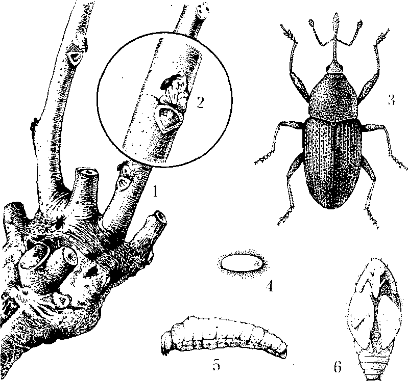 分布为害 桑象虫分布在日本、中国、朝鲜,中国的江苏、浙江、四川、山东、安徽、贵州、辽宁、广东、台湾等省均有发生。幼虫在形成层及附近组织蛀食,致使皮层与木质分离,形成孔道,使皮层变薄,很易撕破。成虫在春季食害冬芽及萌发后的芽芯,降低或延迟发芽及成梢率,影响春叶产量。夏伐后又取食截口枝下定芽或萌发芽梢,致整株桑芽不能萌发而枯死。6月后成虫盛发期,又在梢基部咬食和产卵,致使新梢枯萎或折断,对秋叶也带来影响。 防治 采取齐拳或定芽上方剪伐,确保顶芽生长;不用桑株作围篱,以免形成半枯枝,从而减少桑象虫产卵场所;桑象虫旋小蜂寄生桑象虫老熟幼虫达20.5~68.2%,故对整株修剪的枯桩应加保护,伐条后1~2天内及时喷布50%杀螟松乳油、50%辛硫磷乳油或90%敌敌畏乳油等农药1,000~1,500倍液,90%乙酰甲胺磷乳油3,000倍液,先后3次均有良好效果。 桑象虫又称“桑象甲”。鞘翅目,象鼻虫科。年发生一代,成虫越冬。为害桑芽的主要害虫之一。一年内有两个关键为害期,一为春季冬芽萌动期食害冬芽;又一为伐条后,成虫食害截口以下定芽、潜伏芽,芽开叶后还食害嫩茎。防治方法:1.冬季修除枯桩。2.用6%可湿性六六六250倍等药剂杀虫。 桑象虫mulberry small weevilBaris deplanata Roelofs,又称桑蛘、象鼻虫、桑船象。鞘翅目,象甲科。分布于江苏、浙江、四川、山东、安徽、贵州、辽宁、广东、台湾等省区;日本和朝鲜半岛也有分布。成虫体长4 mm,长椭圆形,黑色,稍有光泽,头管状向下弯曲形如象鼻。卵长椭圆形,乳白色。幼虫体柔软粗肥,圆筒状,稍弯曲,无足。蛹纺锤形,乳白色。成虫食害桑芽,一年发生1代,以成虫在桑半截枝皮下化蛹穴内越冬。防治措施:冬、春进行严格整株,彻底修除枯桩;伐条后1~5天,普遍喷用50%杀螟松或50%甲胺磷1 000倍液。
