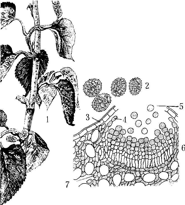 病原 桑赤锈病的病原菌为桑锈孢锈菌,锈菌目,半知锈菌科,锈孢锈属,学名为Aecidium mori(Barcl)Diet。本病原菌是一种简单的锈菌,只产生锈子器和锈孢子,锈孢子发芽侵入桑绿色组织,在表皮下形成菌丝,并生出吸胞插入细胞内摄取养分。吸胞长7~15微米,大多呈圆筒形,有时尖端呈螺旋状,也有分叉。锈子器球形直径约150微米,最大可达400微米左右。周围有一层护膜,成熟后隆起突破寄主表皮组织。锈子器内底部有圆形担子梗,无色,顶生连锁状锈孢子。新生幼小的锈孢子为无色、圆形,逐渐呈橙黄色,成熟的锈孢子具厚膜,表面附有许多微小突起。锈孢子长宽为11~15×13~18微米,当锈子器突破表皮后,发育呈钟状,锈孢子即从锈子器破口而出。 侵染 桑赤锈病以菌丝体在桑树枝条内越冬。中国南方桑树全年有绿叶,具备以锈子器和锈孢子越冬条件。长江流域因锈孢子抗寒力弱,一般不能越冬。枝条上病斑大多数已经坏死,已无致病性,只有与枝迹十分接近以及叶痕、芽鳞上的病斑有致病作用。这些病斑内的菌丝侵入桑芽,到次年随桑芽萌动而发育,使桑芽发病。一般在4月上旬至4月下旬 (广东气温较暖,则在2月份) 初次侵染发病,所形成的锈孢子又可飞散到新梢、叶片、花椹而再次侵染,条件适宜时,可不断引起再侵染。病菌锈孢子侵染发芽温度为5~36℃,最适温度13~28℃,相对湿度93%。此病从春季桑芽萌发至秋季连续发生。温度高于30℃,湿度低于80%,则发病抑制,或骤然停顿。中国南方温暖地区,全年每个季节都有发病,而以5~6月和9~10月为发病高峰期。长江流域因秋旱影响,主要在春夏季4~6月发生严重,黄河流域雨季较迟,发病期在4~10月之间,雨季特别严重,不同桑树品种抗病力有差异。广东的伦教40号比普通荆桑容易感染发病,山东的鲁桑品种如: 大鸡冠、小鸡冠、黑鲁桑和大白条等品种也易发病,而黄鲁桑和湖桑32号则比较抗病,但湖桑32号在江苏、浙江等地都发病严重。江南桑园新老树混栽、春伐、夏伐兼行的北方间作桑园在收获桑叶时不伐条的,山东留枝留芽收获的,山西出扦法收获的,广东留大树尾收获的,都在桑树生长期间,留存绿叶,给病原侵染留有过渡存活的机会,均易发病。 病症 病原菌侵入桑树的幼芽、嫩叶、新梢以及花椹等绿色组织,发病后病芽局部肥厚,弯曲呈畸形,产生橙黄色病斑,生长停顿,变焦脱落。叶部受害时,病斑发生在正背两面,在叶面的多呈散发性点状病斑,在叶背的多沿叶脉蔓延呈网条状病斑。新梢上的病斑,初黄色椭圆形,后老化变暗褐色的坏死斑,凹陷,病斑部的木质变黑,易折损,常导致病斑部以上枝条产生枯梢现象。病斑上初时带有光泽透绿细小圆点,逐渐扩大隆起如小泡状(青泡),以后青泡变黄,突破表皮,产生橙黄色病斑(黄泡),从病斑上散出橙黄色粉状物后老化,变焦褐色(焦泡)。 防治 剥除初次侵染病芽,彻底夏伐有消除病源,控制再次侵染蔓延的效果; 在初发病桑园用25%可湿性粉锈宁粉剂1000倍液,喷布2~3次,喷药间距20天左右,可控制发病。 桑赤锈病俗称“金桑”、“金叶”、“黄疽”、“赤粉病”。桑真菌病类。本病主要为害嫩叶、叶片、叶柄和新梢。最初病叶出现绿色针尖状斑点,后扩大隆起呈小泡泡状,终变黄色,金黄色粉未状锈孢子突破叶皮表层散出,故得名“金桑”。病害部位往往肥肿,弯曲呈畸形,新梢较久病斑变黑褐色而凹陷。低温多湿是发病的重要诱因,春夏之交易发此病。防治方法:1.加强桑园管理作好排水工作。2.消灭病原。患病初期,即时去除病芽、病叶、病梢。3.药物防治,用20%萎锈灵乳剂300—500倍液,25%粉锈宁1000倍液,40%拌种灵300倍液在发病初期喷雾防治;用波美0.4—2.5度石灰硫磺合剂加0.2%硫酸铁铵混合液杀灭叶表层病原。 桑赤锈病mulberry red rust又称赤粉病、金桑。分布于江苏、浙江、四川、广东、广西、云南、山东、山西、福建、安徽、江西、河北、陕西、甘肃、辽宁、新疆、台湾等省区的蚕区;印度、日本和朝鲜半岛也有分布。叶片被害后,肥厚隆起,呈橙黄色,并沿叶脉、叶柄方向蔓延;叶柄、新梢被害后,弯曲成畸形,布满橙黄色粉末。病原Aecidium mori (Barcl.)Diet.为担子菌亚门冬孢菌纲锈菌目不完全锈菌科锈孢锈菌属的真菌,以菌丝体在病枝芽中越冬。可在早春剥除病芽;用25%粉锈宁1 000倍或40%拌种灵300倍液喷。 |